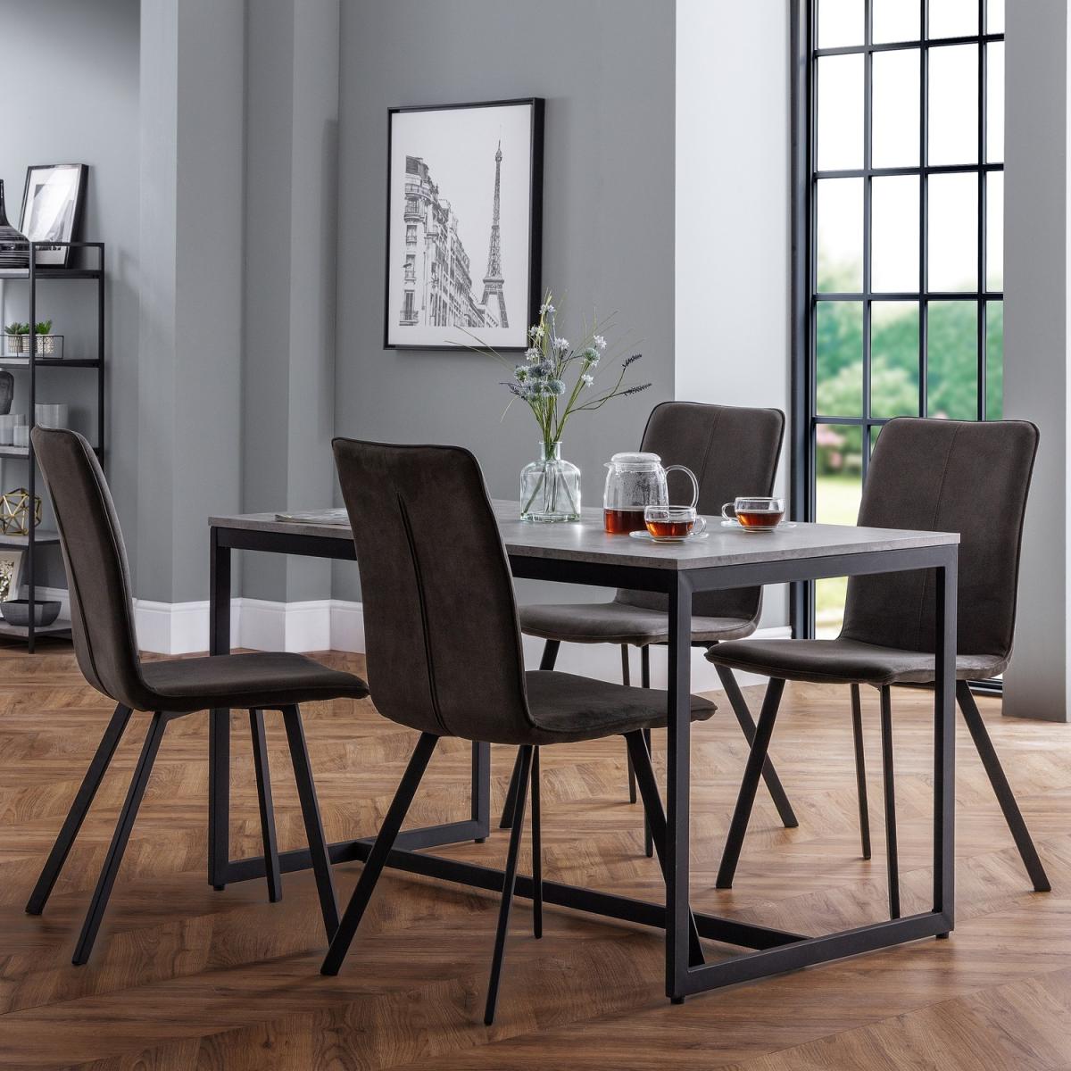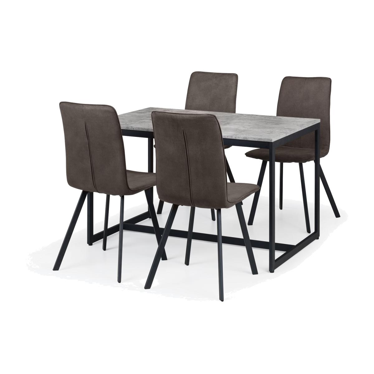 Simplistic in design with a contemporary style, the Staten Dining Table will add a stunning industrial look to any living and dining area. Constructed from a black coated metal frame, complemented by a striking concrete effect tops, to create a very stylish, modern product. Part of the Julian Bowen Staten Dining and Occasional Collection. Complemented by Monroe chairs.