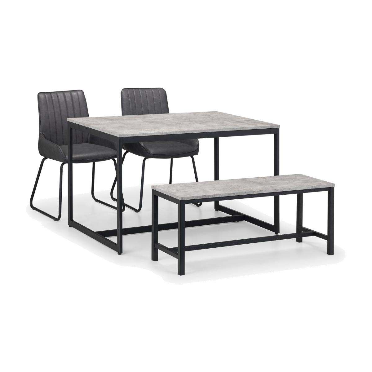 Simplistic in design with a contemporary style, the Staten Dining Table will add a stunning industrial look to any living and dining area. Constructed from a black coated metal frame, complemented by a striking concrete effect tops, to create a very stylish, modern product. Part of the Julian Bowen Staten Dining and Occasional Collection. Complemented by Soho chairs.