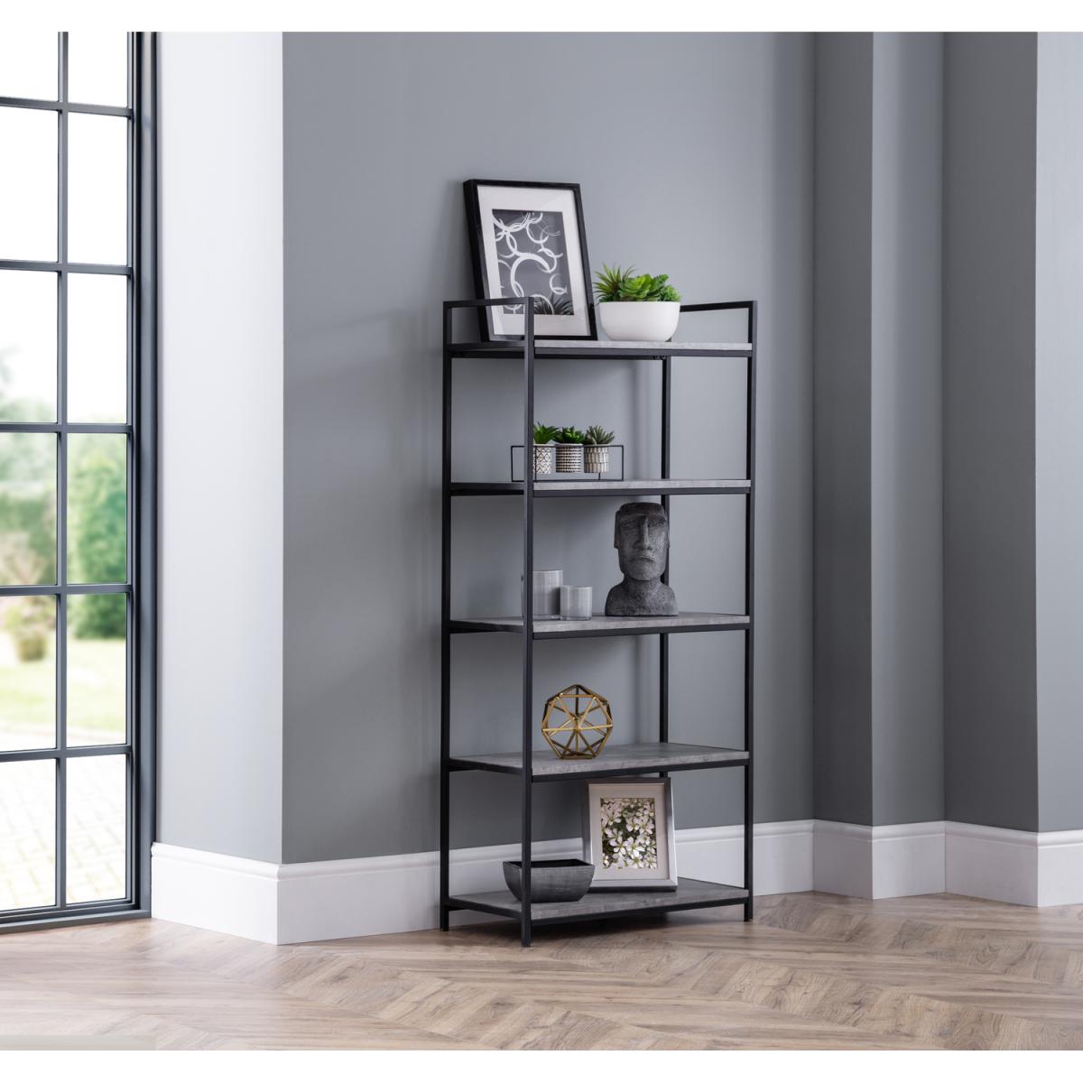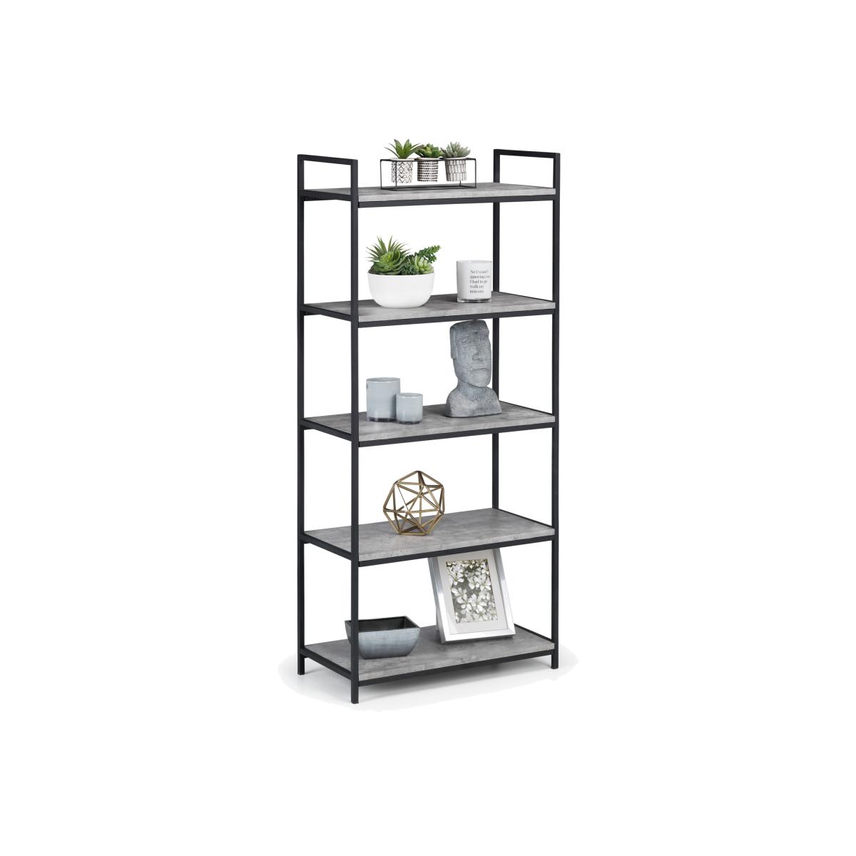 Simplistic in design with a contemporary style, the Staten Tall Bookcase will add a stunning industrial look to any living and dining area. Constructed from a black coated metal frame, complemented by a striking concrete effect tops, to create a very stylish, modern product. Part of the Julian Bowen Staten Dining and Occasional Collection.