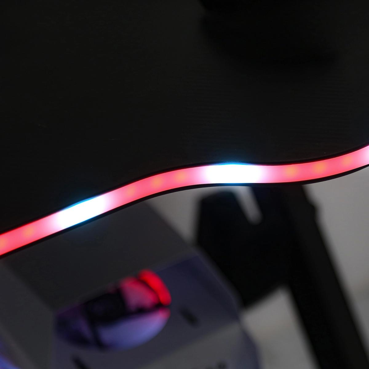 You can enjoy PC and console gaming, thanks to the spacious carbon fibre-feel desktop providing enough room for your monitors and keyboards. No more accidental spillages, place your drinks in the rotatable cup holder. A wobbly monitor won't be an issue, as the metal frame and adjustable footpads keep the desk stable. Colourful RGB lights around the table edges add a cool atmosphere to get you in the zone at night.