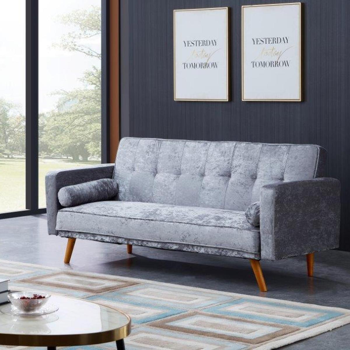 This Fabric Sofa Bed is the right choice if you are looking for modern style, practicality and aesthetic appeal all in one sofa bed. This elegant piece of furniture will look great in any room, which makes this a great addition to any home. The sofa has a high back and foam sprung seat cushions for ultimate comfort and is upholstered in crush velvet fabric and is finished off with a buttoned backrest. Also included are tubular pillows and solid wooden legs. This 3 seater sofa bed can be turned into a bed in seconds using its click clack mechanism ensuring both an easy and wonderful night's rest for you or your favourite house guests.