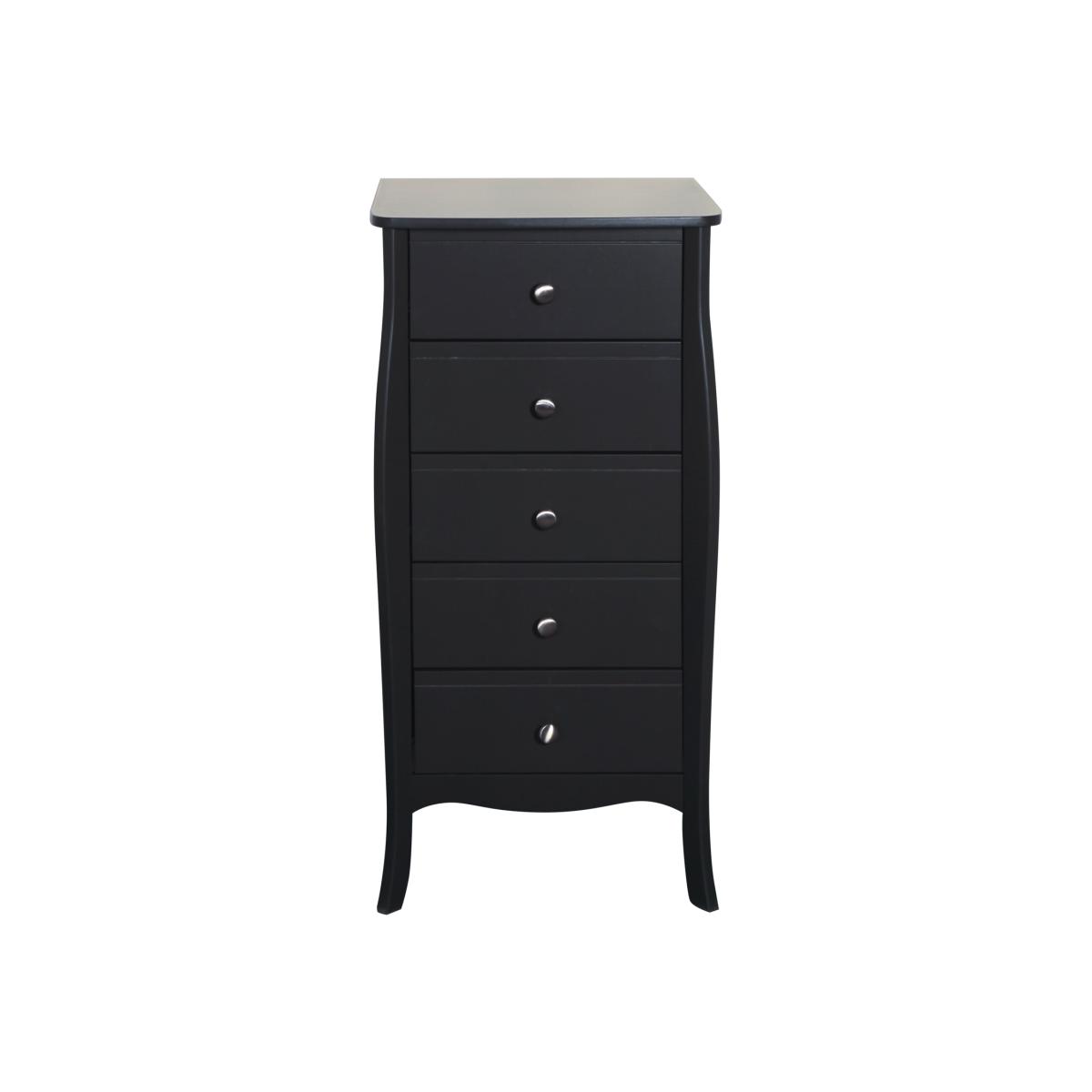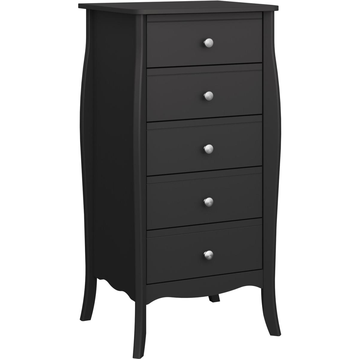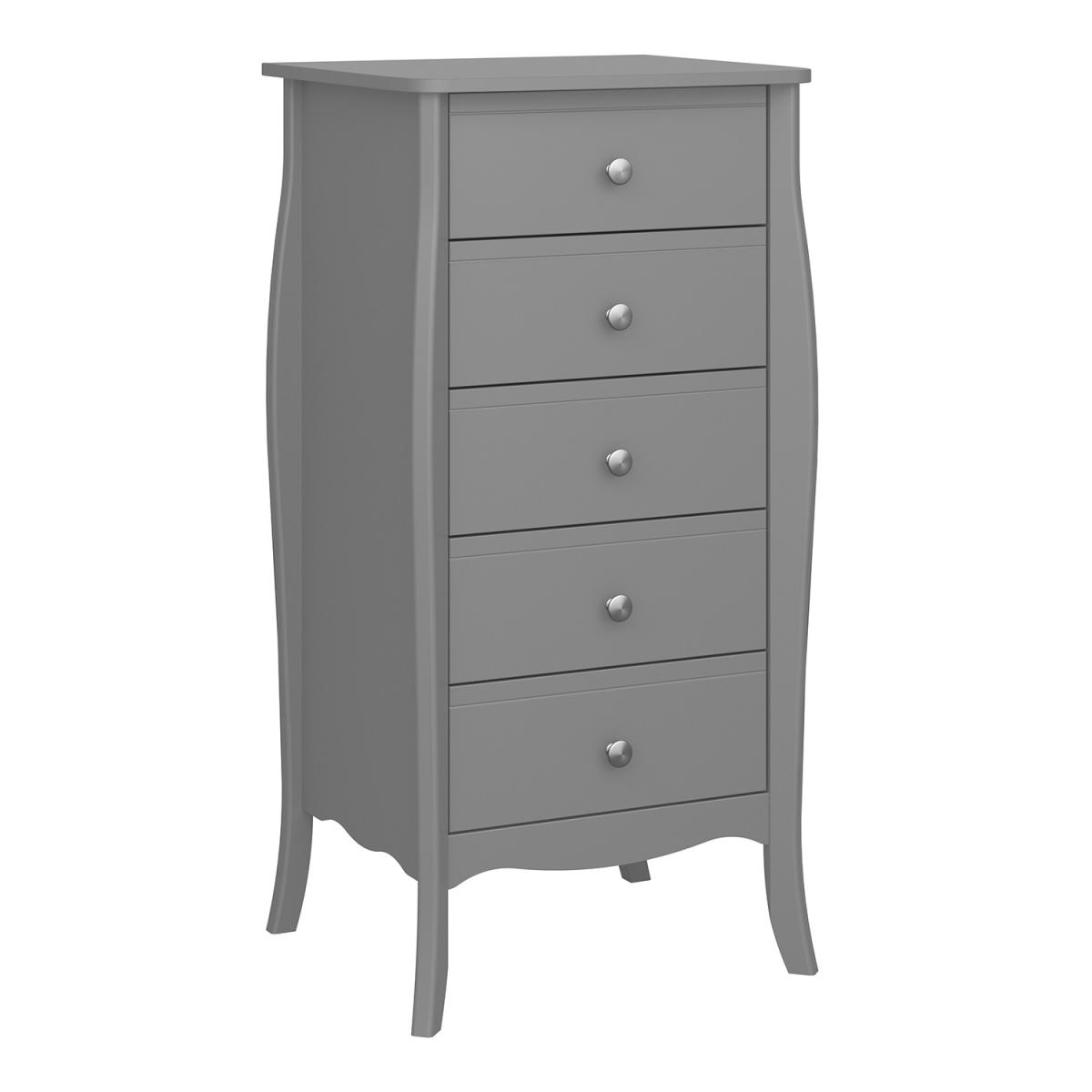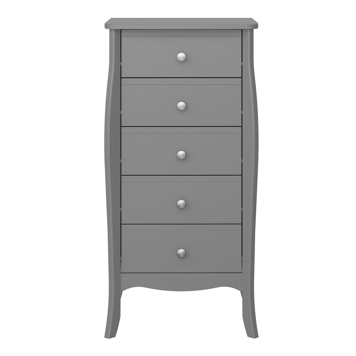 This Provence-inspired Baroque narrow chest brings a touch of elegance to any bedroom. With delicate detailing, crisp finish and stainless steel handles, this piece works well with any style of room. This classic chest offers 5 drawers of storage space with a compact footprint, making it ideal for any size of room