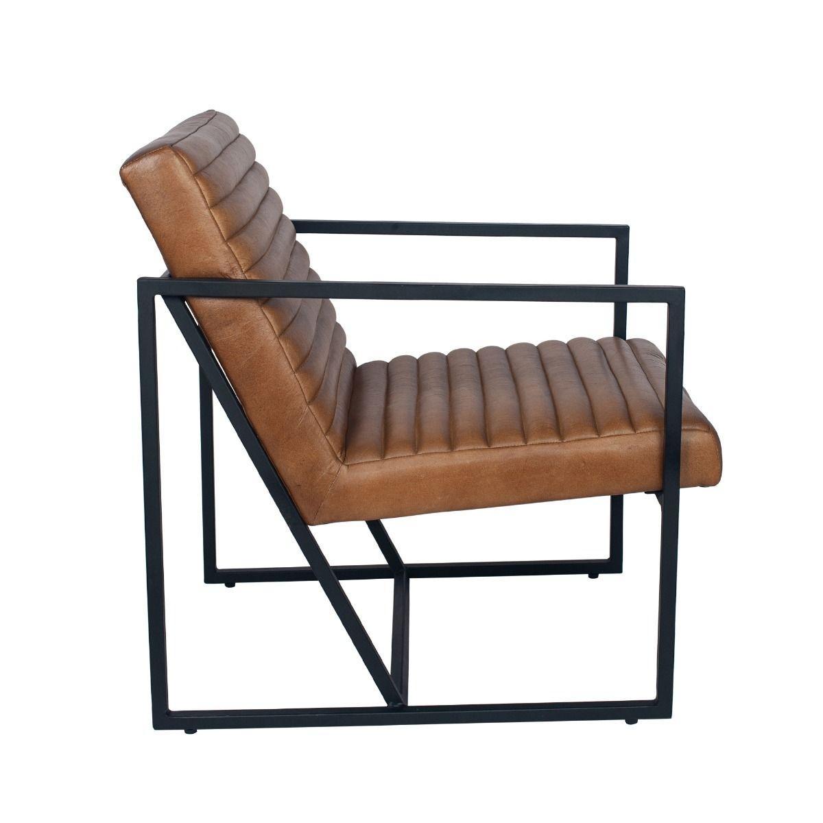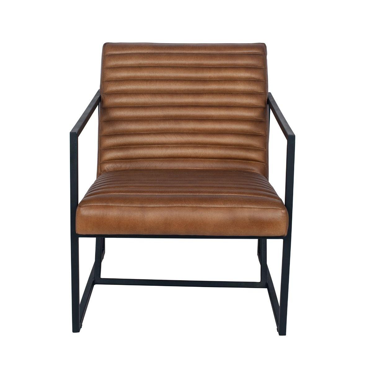 Retro inspired natural brown leather armchair. Add a retro touch to your home with the stunning Stefano natural brown leather and iron arm chair. Featuring hand crafted linear padded detailing and iron frame. Place in any lounge, bedroom or dining room.