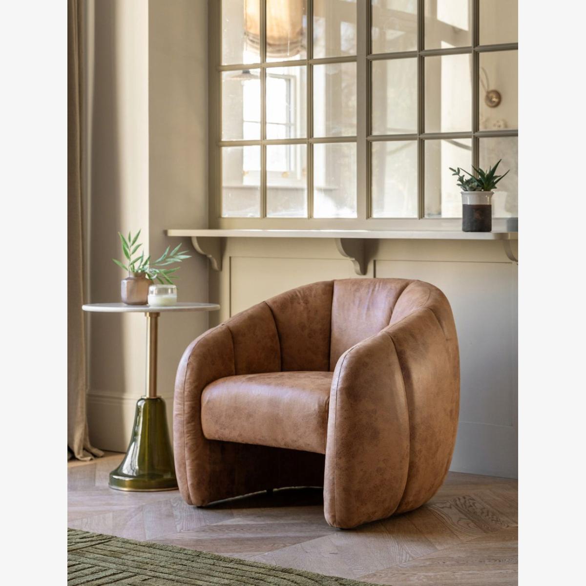 Add a stylish design piece to a room with this cocooning tub chair. Fully upholstered in tan leather with curved panel detailing this chair would look right at home in a bedroom or living room. Also available in moss green boucle