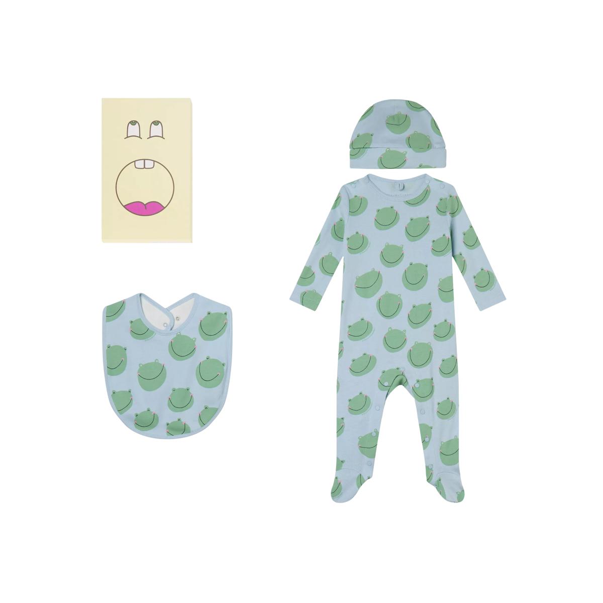 Stella McCartney Kids Baby Cotton Rib Frog Print Sleepsuit, Beanie Hat & Bib, Blue