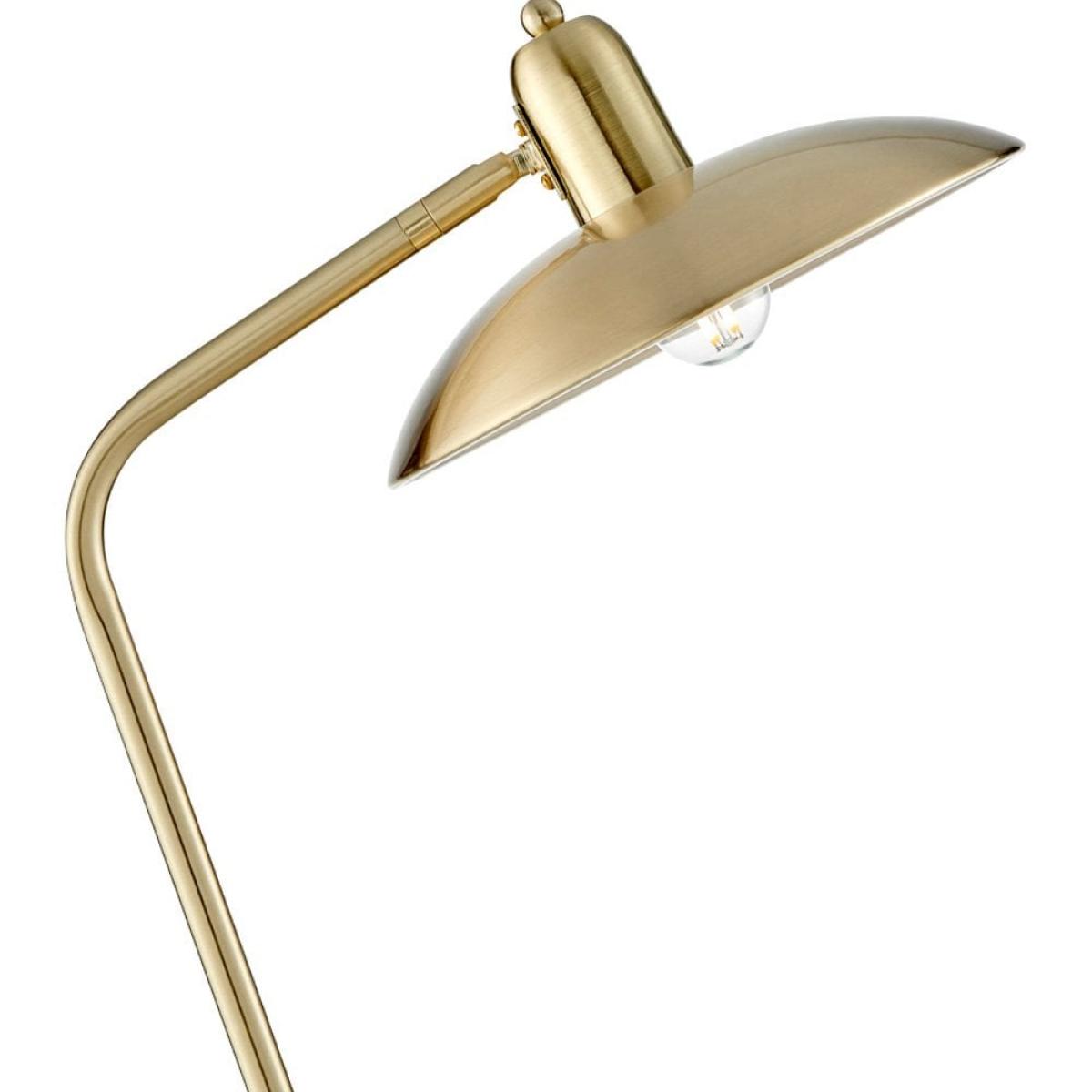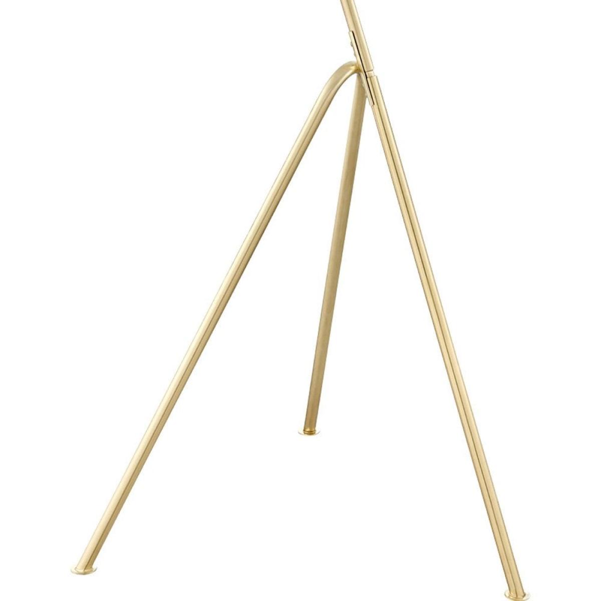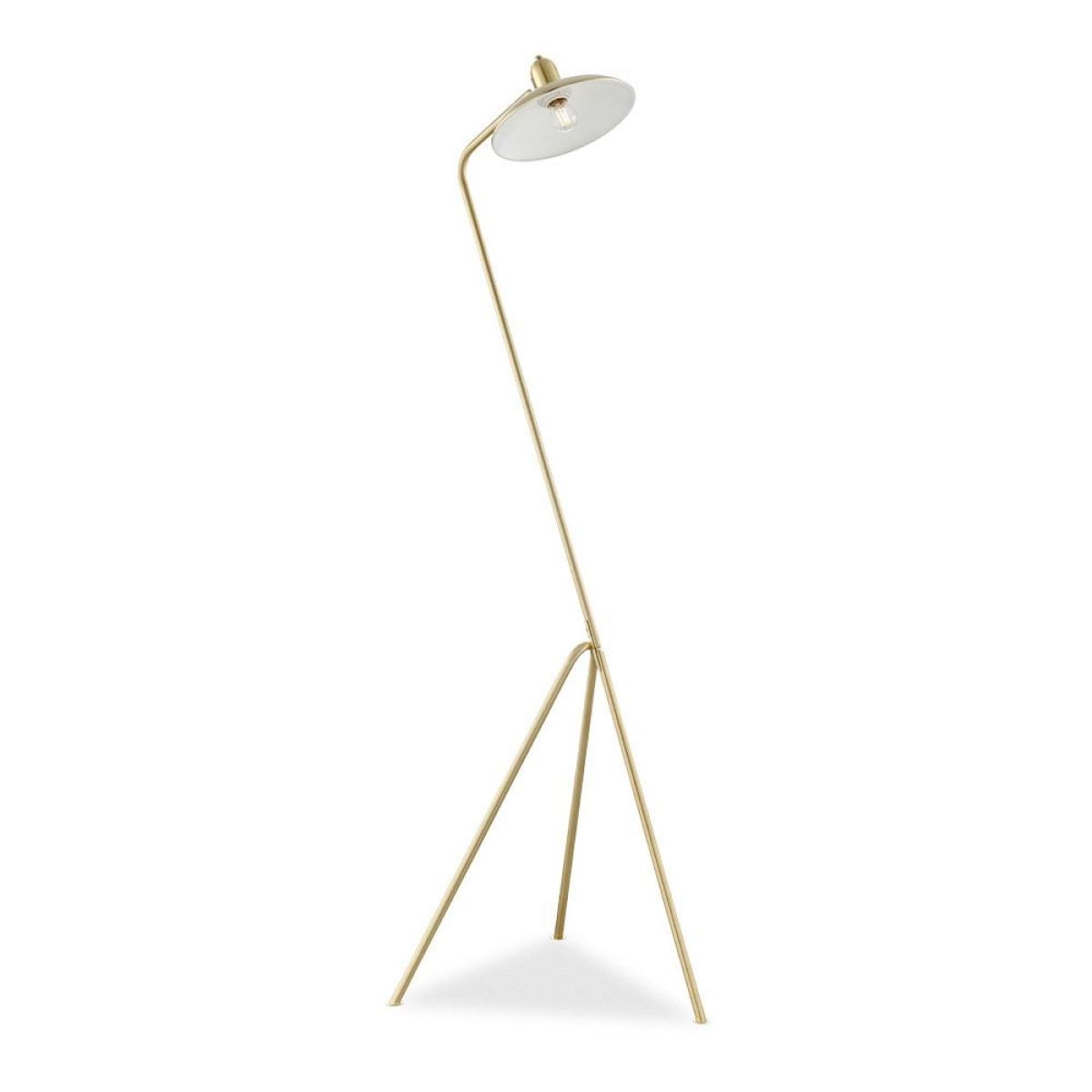Inject modern design into your home with the Stellan. This minimalistic floor lamp features an abstract saucer-shaped shade in a brass metal finish, complemented with a streamlined, three-legged brass metal stand - adding an Art Deco flair to your interior. Whether it's your living room nook or dining room corner, the Stellan creates a warm and relaxing glow that fills the room.