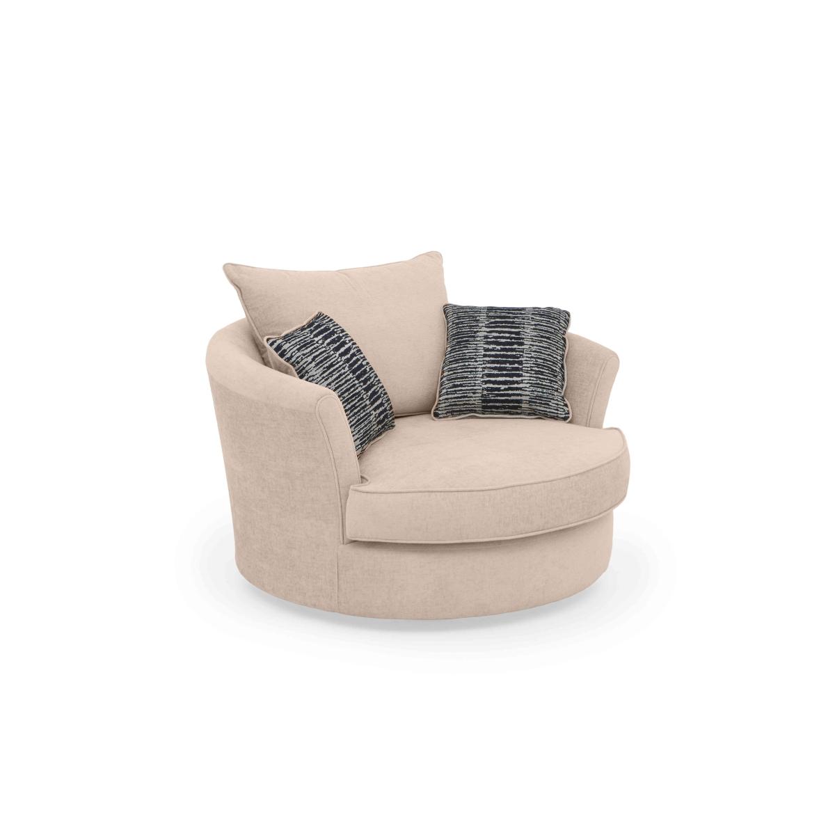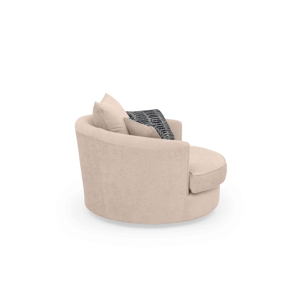 Elegant glam style. Fabulous comfort. Wide choice of sofa styles and sizes. Plenty of accent pieces to complete the look. Our Stellar collection offers all that and more. With sweeping curves and beautiful fabric upholstery the look is striking. Seats are deep and wide and exceptionally comfortable, and you can even upgrade to Encore foam seat interiors and enjoy our 5-year cushion plumpness guarantee. Sofas are available in two styles – scatter back and classic back – and the collection also includes armchairs, storage footstools and even sofa beds so you can give every corner of your living room the Stellar star treatment. The Stellar range is entirely handmade and exclusively available at Furniture Village. Set on a swivel base, our Stellar twister chair is fun and fabulous. Choose from a wide range of luxe upholstery fabrics. Handmade. Why you'll love it This twister chair is the accent chair that’ll be everyone’s favourite. Glam elegance, exceptional comfort. Encore foam seat cushion with 5-year plumpness guarantee. In a choice of upholstery fabrics with matching or contrasting piped edges. With 2 patterned feather-filled scatter cushions. Scatter cushions have the same fabric as the twister chair on the reverse. Handmade for Furniture Village. This twister chair is part of our Stellar range. What you need to know Medium comfort level. Seat suspension: zig-zag springs. Seat cushioning: foam. Back suspension: elasticated webbing. Back cushioning: foam. Scatter cushions: feather. Feet are removable. Flattening and shading of heavy wear areas on pile fabrics is unavoidable. Clean regularly using a soft brush or vacuum with the curtain attachment. Deal with any spills promptly. Professional cleaning advised for oil- and grease-based stains. Please read our upholstery care guide for more advice.