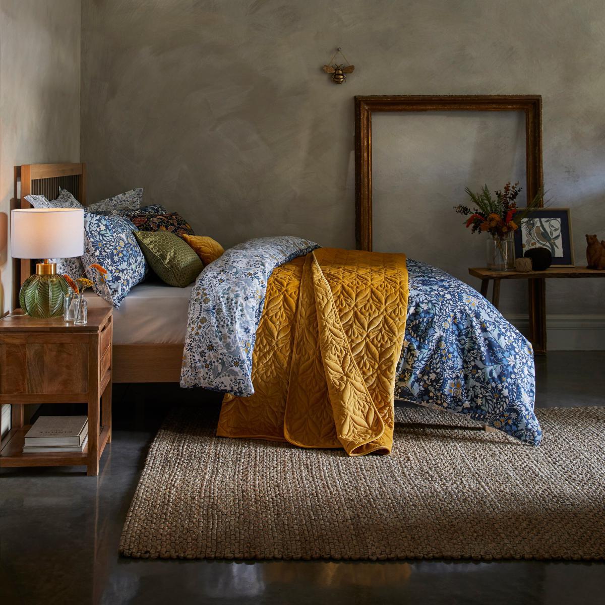 I love the bright, cheerful tone of this yellow velvet bedspread - it’s a versatile statement piece that can instantly lift a neutral or muted bedroom. It works particularly well in contemporary or Scandinavian-inspired interiors, where its clean lines and tactile fabric add a touch of warmth and luxury. For styling tips, consider pairing it with crisp white or grey bedding and simple accessories to let the yellow stand out, or introduce complementary colours like navy or deep green for a more layered look. Practical tips include folding it back at the foot of the bed to showcase layered bedding or adding textured cushions for extra comfort and visual interest. It’s a versatile piece that balances style with everyday practicality.