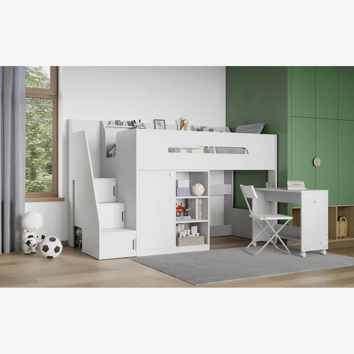Meet the Stepaside High Sleeper Workstation from Flair Furnishings a fantastic choice for kids who need both a cosy bed and a functional study space. This high sleeper is thoughtfully designed with plenty of room for a desk while still providing storage space for toys and other treasures. Safety is a top priority with this bed. Just like our popular Slick Staircase Triple Bunk Bed, the Stepaside comes with wide, sturdy stairs that also serve as storage cabinets. This design not only maximises space but also makes climbing up and down safer and more stable than a regular bunk bed ladder. Plus, the raised side panels create a snug spot for a comfy night's sleep.