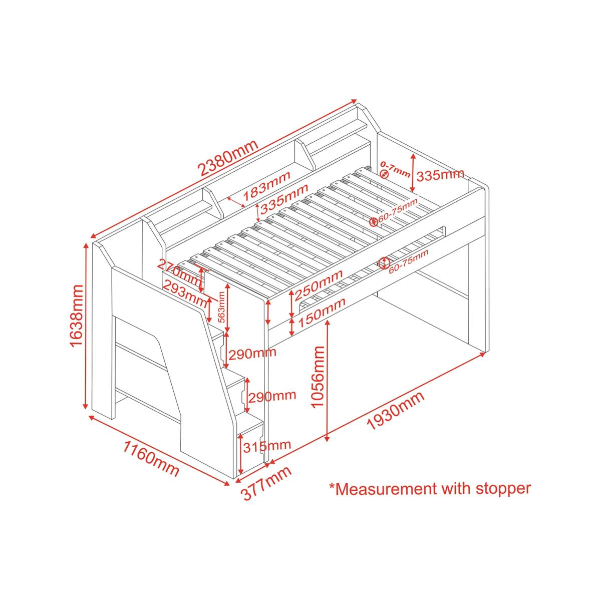 The Stepaside High Sleeper Storage Station in Grey is a Flair Furnishings masterpiece that combines elegance and practicality. Crafted to cater to the needs of busy little ones who cherish their treasures, this high sleeper maximises storage space while ensuring safety remains paramount. The wide-stepped stairs ingeniously double as storage cabinets, offering additional room and enhanced stability. Elevated side panels provide a secure sleep and a cosy one. This comprehensive bundle comprises: - Stepaside High Sleeper Frame - Cube storage unit with three expansive shelves and hanging space - 5-drawer storage chest - a perfect home for your child's clothing collection. Crowning, this design is a meticulously crafted multilayered shelf, ideal for storing trinkets or showcasing a cherished teddy bear. Elevate style and storage with the Stepaside High Sleeper Storage Station in Grey- where safety, functionality, and aesthetics come together seamlessly.