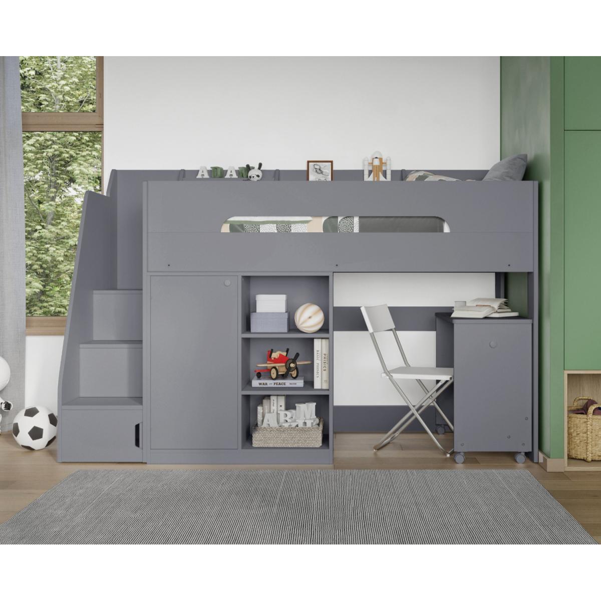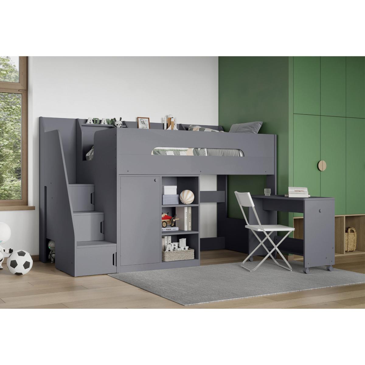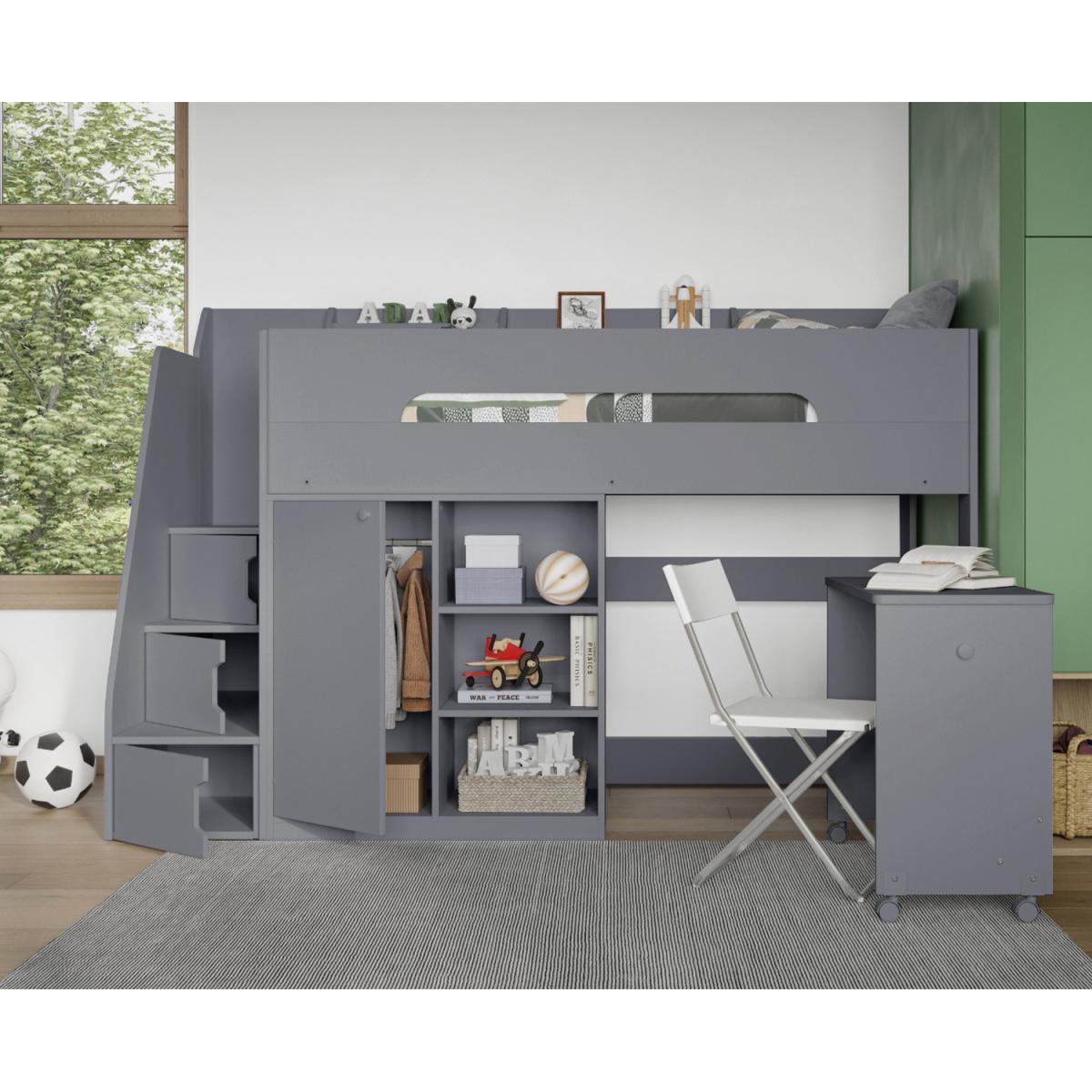 Introducing the Stepaside High Sleeper Workstation in Grey by Flair Furnishings - a versatile solution for young ones with big dreams. Designed with both functionality and safety in mind, this high sleeper offers a stylish and efficient space-saving setup. The wide-stepped stairs provide secure access to the elevated bed and cleverly integrate storage cabinets, ensuring a clutter-free environment. Crafted with the utmost comfort in mind, raised side panels offer a cosy night's sleep. This all-inclusive bundle features- Stepaside High Sleeper Frame- Cube storage unit with three spacious shelves and hanging space for clothes- Pull-out desk, perfect for tackling homework or creative projects. Topping off this design is a skilfully crafted multilayered shelf - a perfect home for cherished keepsakes or beloved stuffed animals. Elevate your child's room with the Stepaside High Sleeper Workstation - where style meets practicality in a stunning shade of Grey. The Stepaside Workstation requires one single (190x90cm) mattress.