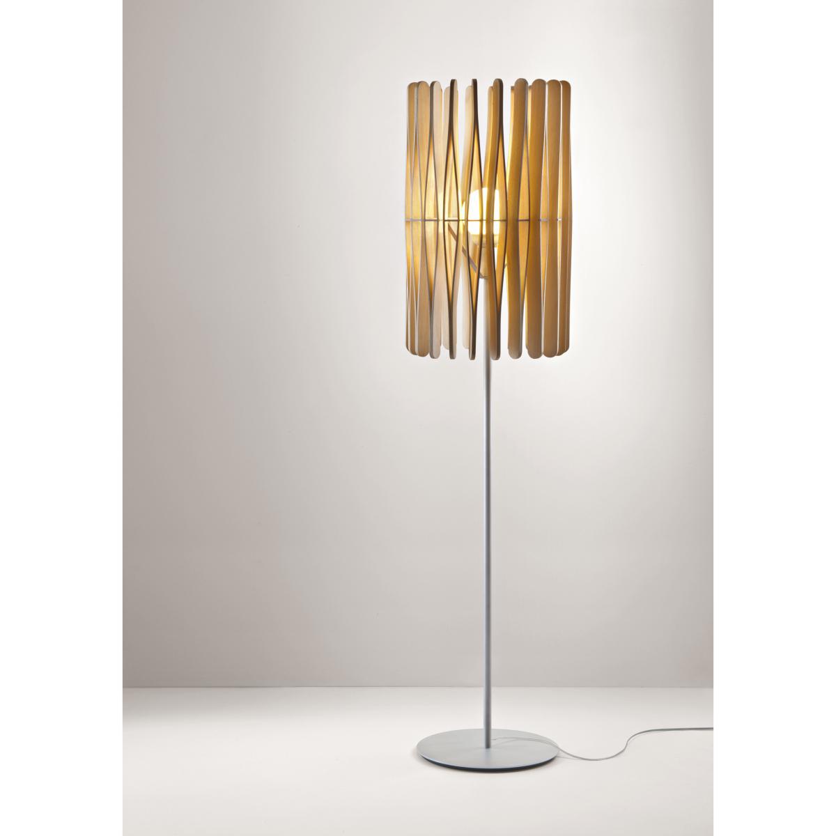 Stick is the new lamp collection of designer Matali Crasset for Fabbian Illuminazione. It stems from an Ayous wood module, the shape of which is inspired by that of a pair of pliers: two bent elements stretched by a central support. The collection consists of a table lamp, a wall lamp, four floor lamps and five suspension lamps featuring four different diffuser shapes. Light diffusion is by means of a frame decorated with Ayous wood strips. The lamp structure is in coated metal. The pole of the floor lamps is in Toulipier wood or wholly in coated metal. The light bulb is energy saving.