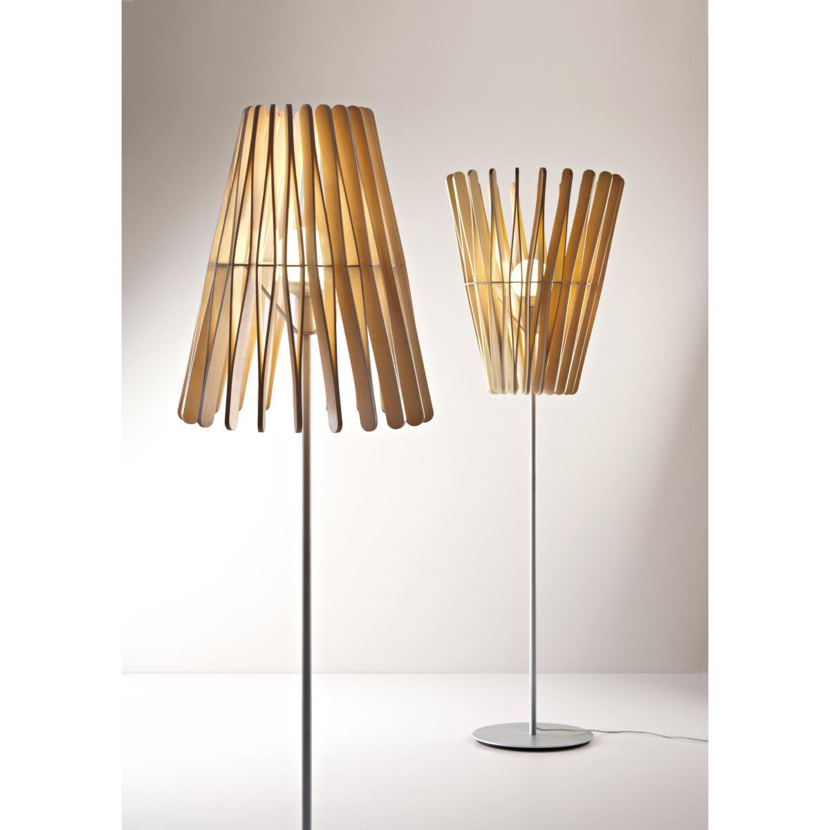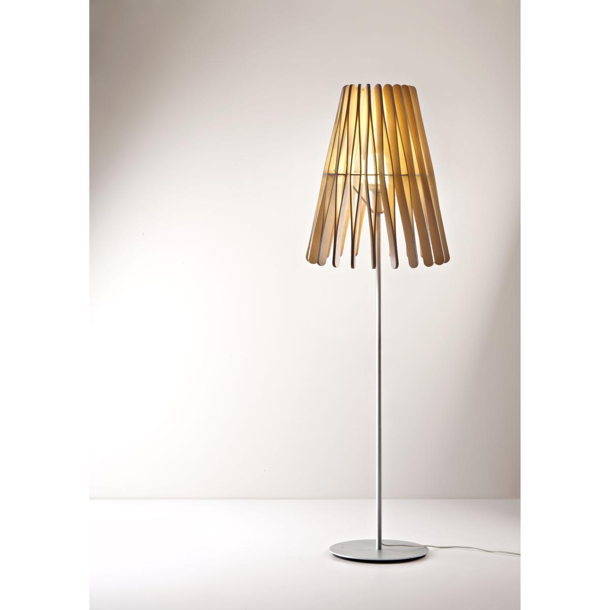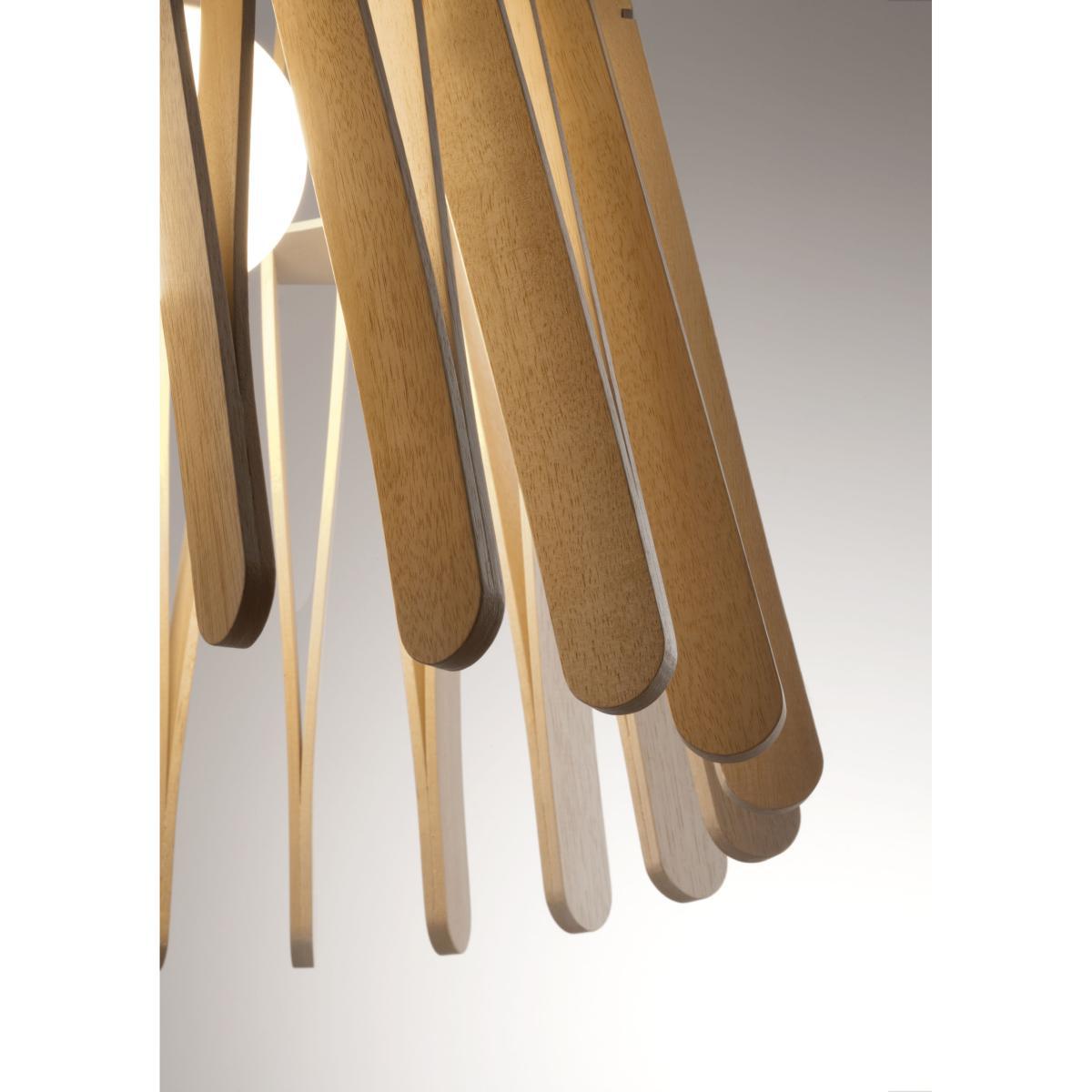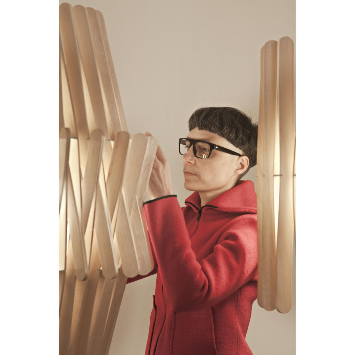 Stick is the new lamp collection of designer Matali Crasset for Fabbian Illuminazione. It stems from an Ayous wood module, the shape of which is inspired by that of a pair of pliers: two bent elements stretched by a central support. The collection consists of a table lamp, a wall lamp, four floor lamps and five suspension lamps featuring four different diffuser shapes. Light diffusion is by means of a frame decorated with Ayous wood strips. The lamp structure is in coated metal. The pole of the floor lamps is in Toulipier wood or wholly in coated metal. The light bulb is energy saving.