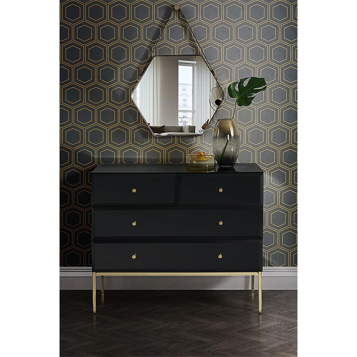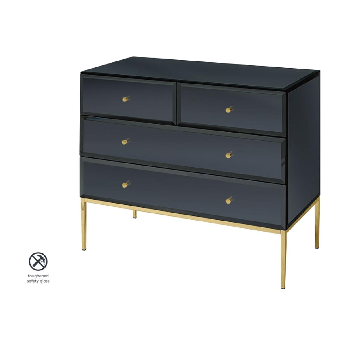 Contemporary design with elegant, brass frame. Extremely strong and durable toughened black glass with deep bevelled edges. Four spacious drawers with black felt lining and soft close mechanism, perfect for organising clothing, bedlinen or other items. Tapered brass handles. Minimal assembly required, approximately 5 minutes. Item specification.