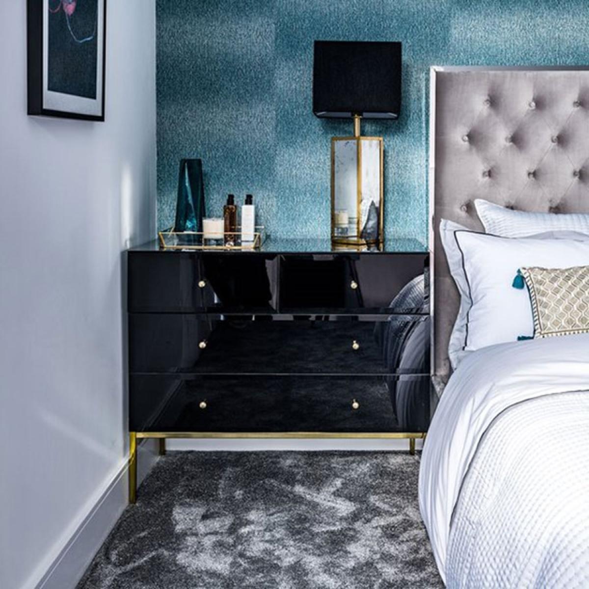 I love this piece for its striking combination of black glass and brass, which gives it a bold yet refined character. It works particularly well in modern or contemporary interiors, especially those with minimalist or luxe elements, as the glossy black surface adds a sleek feel while the brass legs introduce warmth and elegance. Practical styling tips include pairing it with neutral or monochrome décor to really let the chest stand out, or contrasting it with textured textiles like velvet or woven fabrics for added depth. It’s a versatile statement piece that can serve as both storage and decor, making it ideal for bedrooms, living rooms, or even hallways where it can bring a touch of sophisticated edge.