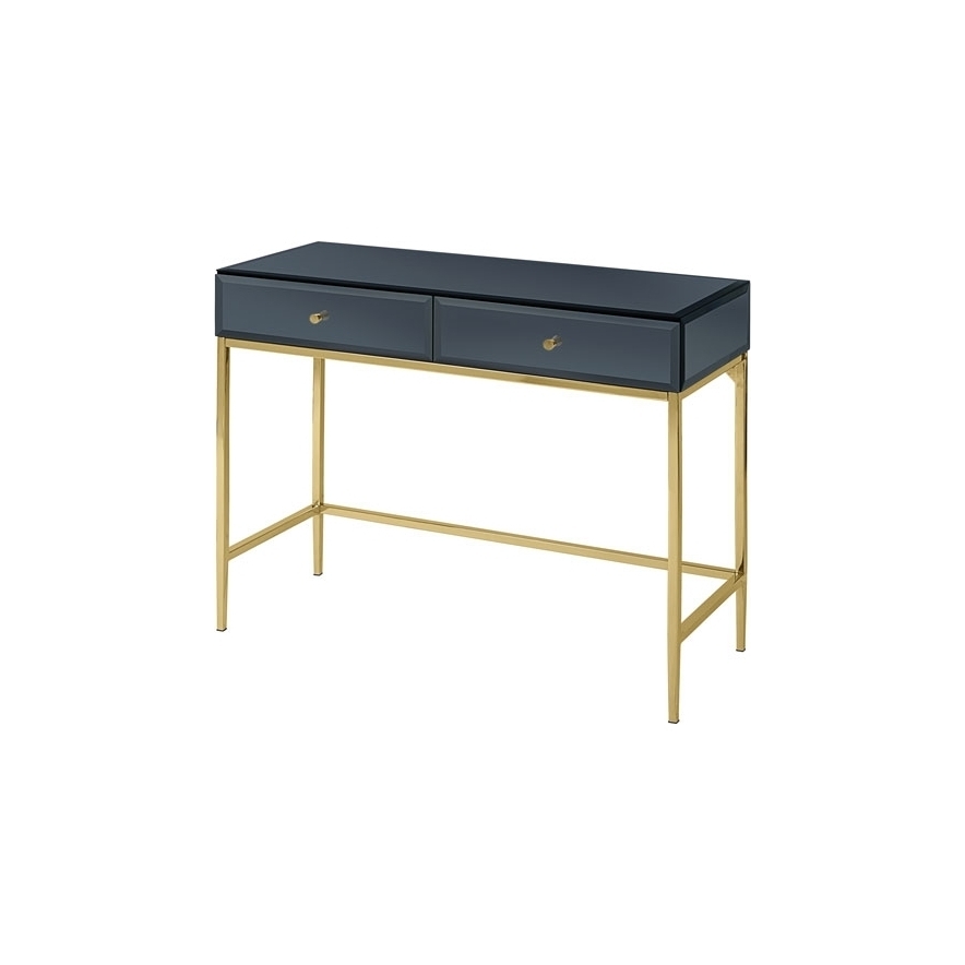 Contemporary design with elegant, taperedbrass frame. Extremely strong and durable toughened white glass with deep bevelled edges. Two deep drawers with black felt lining and soft close mechanism, perfect for organising Jewellery, make up, hair straighteners and personal essentials. Tapered Brass handles. Suitable for use as a dressing table or console table. Minimal assembly required, approximately 5 minutes.