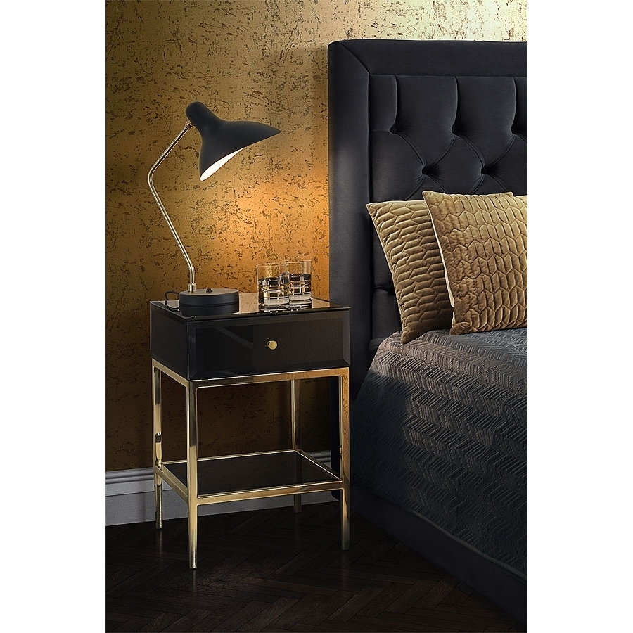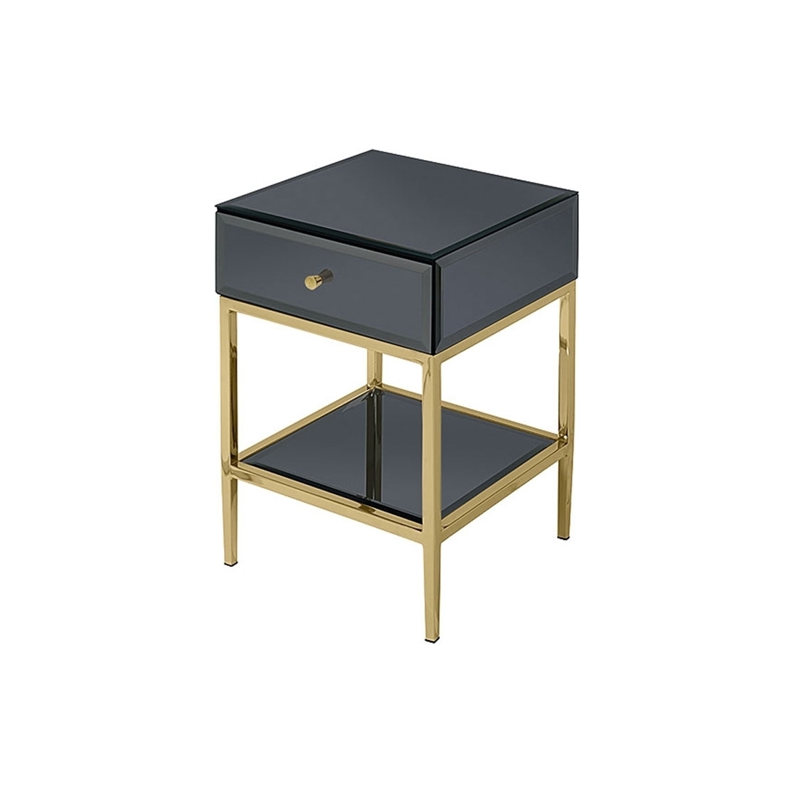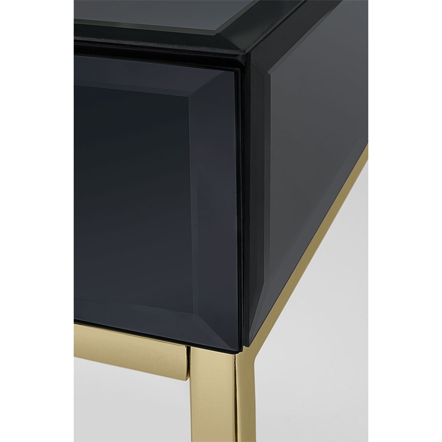 Extremely strong and durable toughened black glass with deep bevelled edges. Drawer with black felt lining and soft close mechanism, perfect for organising personal essentials. Toughened mirror shelf for storing reading material and charging electronic devices. Tapered brass handles. Suitable for use as a side table or bedside table. Minimal assembly required, approximately 5 minutes.
