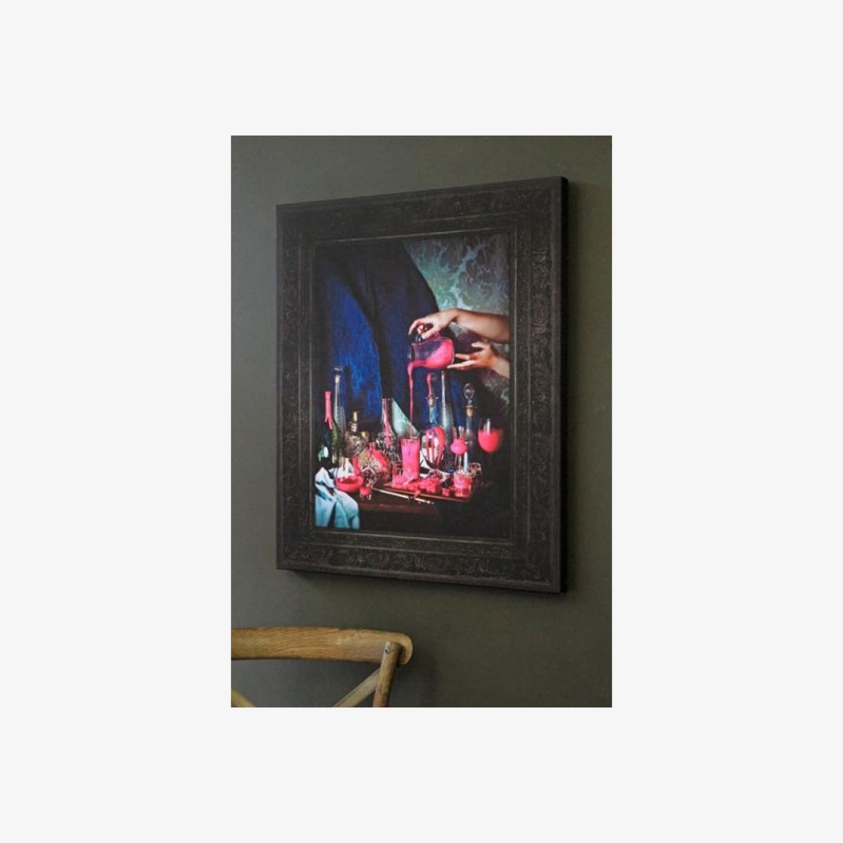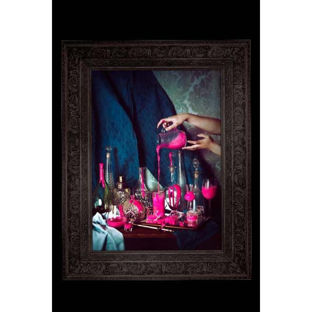 'Still Life' is part of the renaissance collection and features an extra large ornate frame printed onto canvas. This beautiful print, reminiscent of classic Dutch masters paintings, combines modern with the traditional. The painting combines the traditional images of still life, but with a splash of flamboyant pink. We see a ladies hand elegantly pouring pink paint into wine glasses, bottles and decanters, against a traditional curtains backdrop. Due to the stunning nature and size of the canvas, it is ideal as a feature piece for both domestic and commercial purposes and comes with a cleverly integrated large ornate frame, printed onto the canvas, and saving you from having to go out and find that perfect frame! A collaboration between Young & Battaglia and digital artist Himitsuhana, this stunning image is printed onto the finest quality canvas and made in England PLEASE NOTE:The frame is not a solid frame, and is part of the printed canvas - it is printed onto the canvas as is the image.