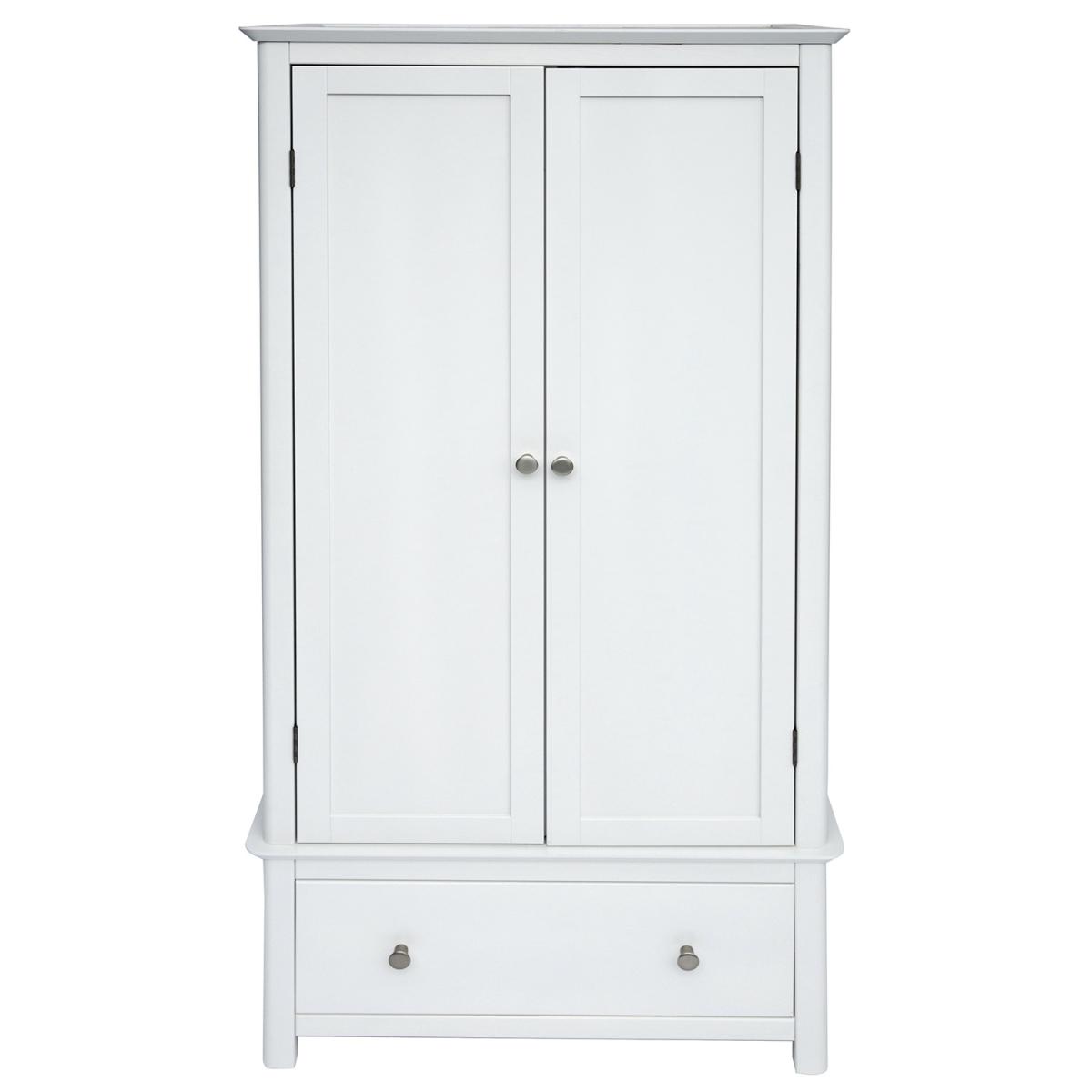 Our wardrobe features ample hanging space and a deep storage drawer, finished in a crisp white paint with complimenting metal handles