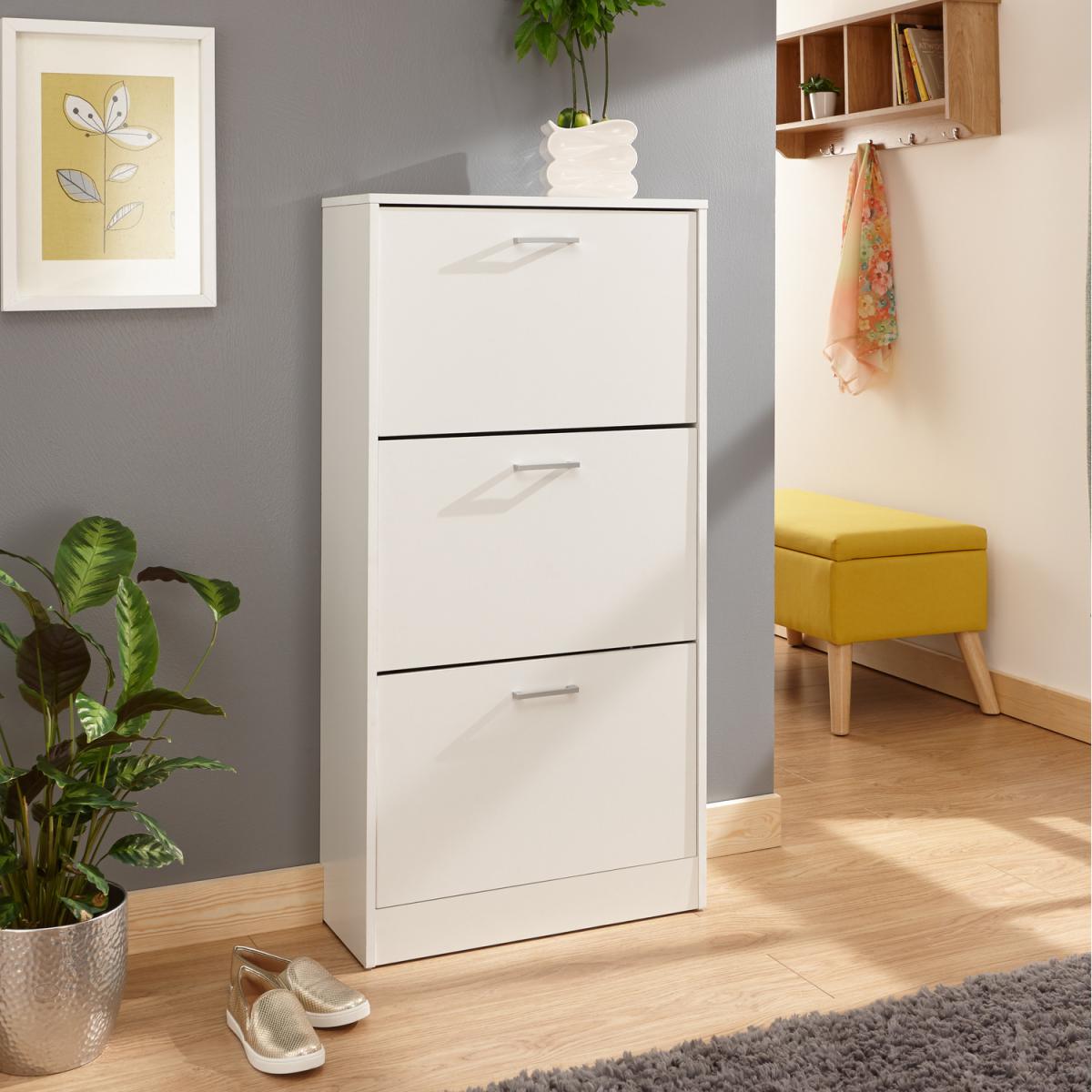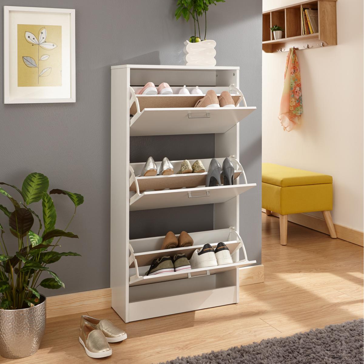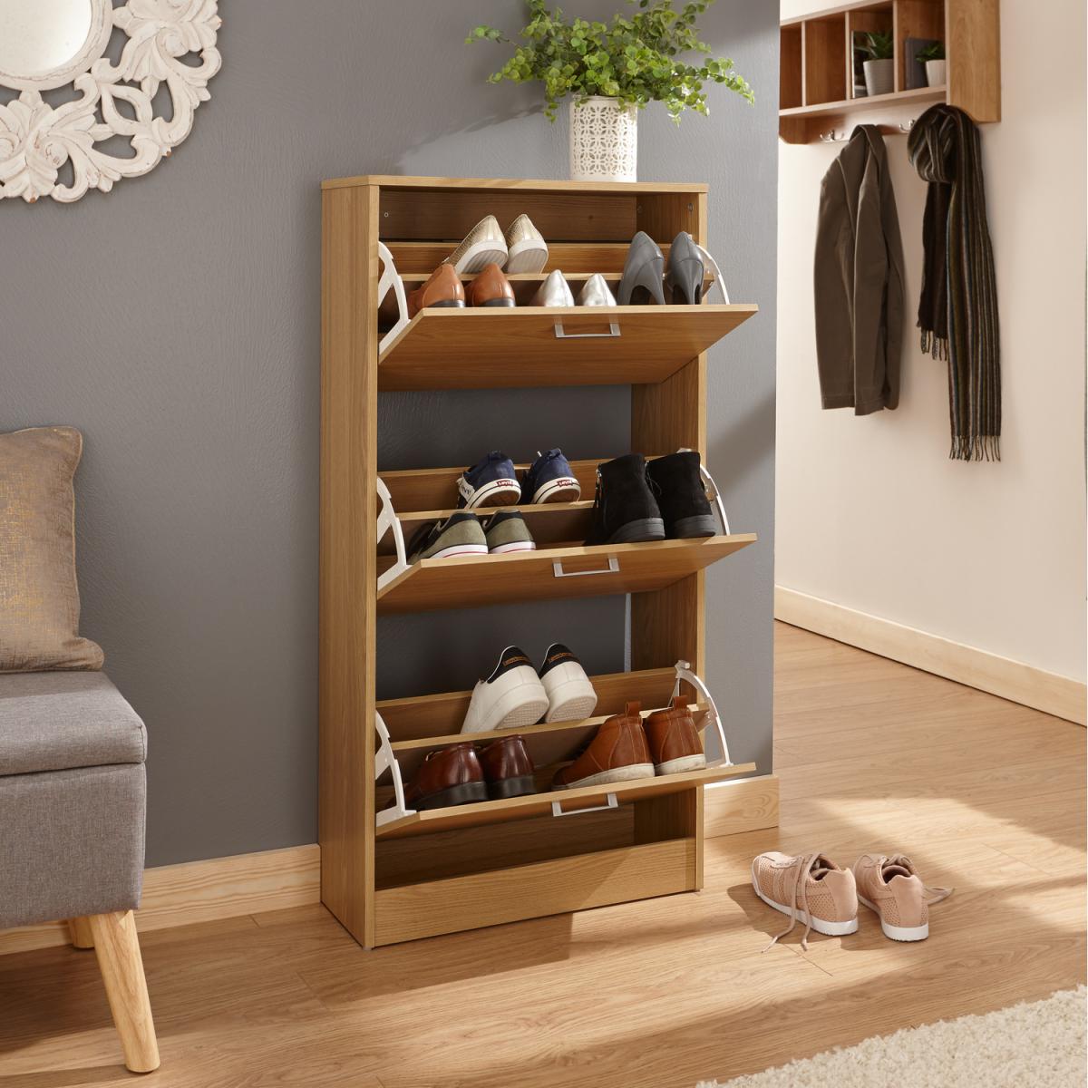 This slim, stylish three-tiered shoe cabinet would look great in any hallway. The Stirling is available in a number of different finishes and features 3 shoe storage sections, capable of holding up to 6 pairs of shoes each.