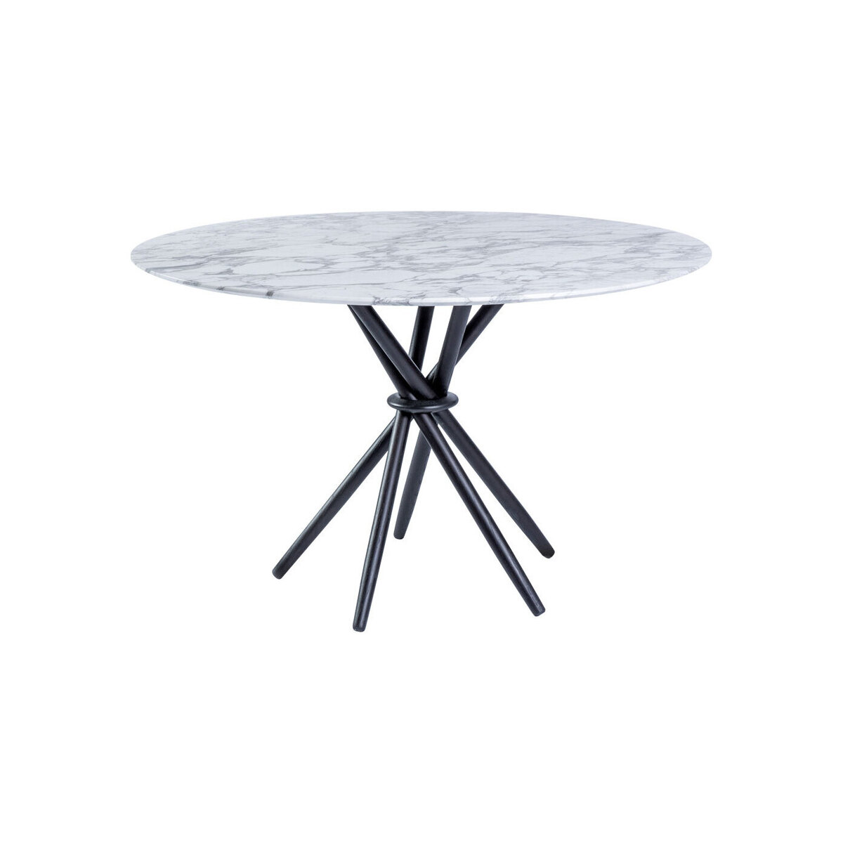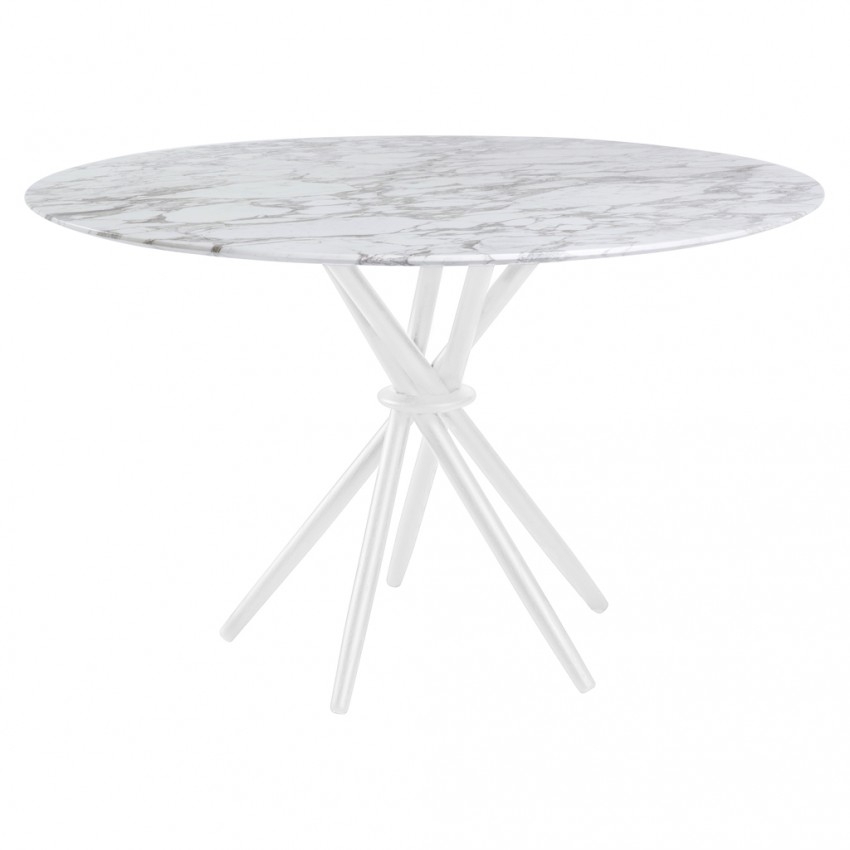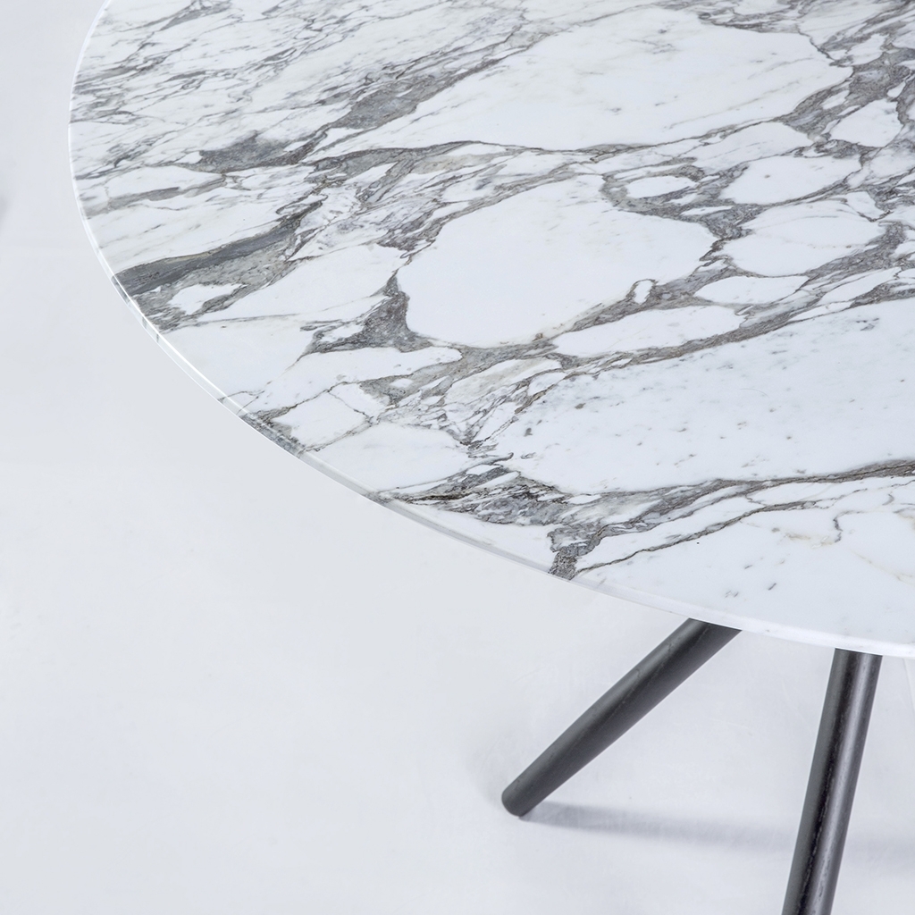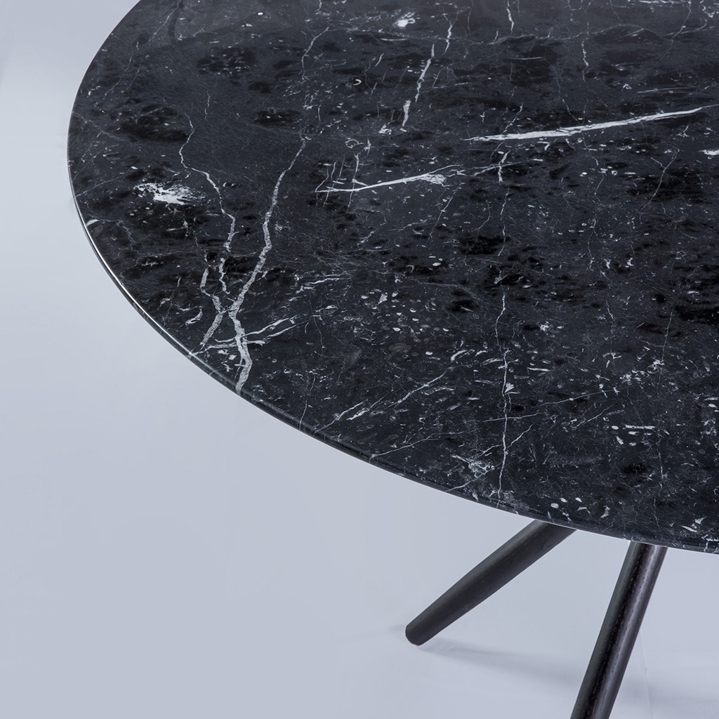 The Stix dining table features a classic round tabletop crafted from exquisite white Arabescato marble. The designer's original vision for this statement-making design started life as five cocktail sticks with a piece of bent wire twisted around the waist and elegantly splayed. The stained American oak legs are interlocked in this unique way creating a circular array of triangles. The resulting structure is one of uncompromising style and stability. Exclusively designed by Magnus Long for The Conran Shop, this instant design classic is made in Italy from the highest quality materials.