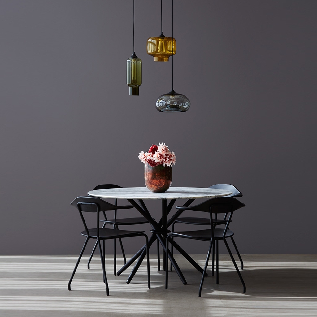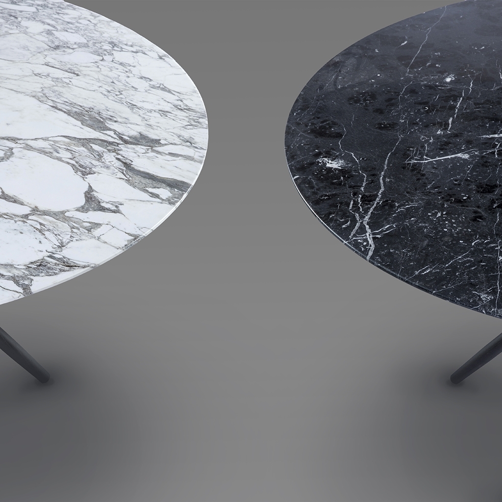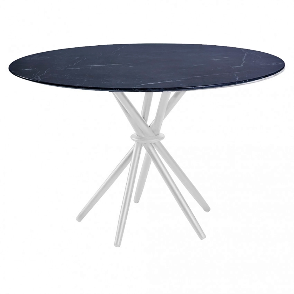 The Stix dining table features a classic round tabletop crafted from exquisite white Arabescato marble. The designer's original vision for this statement-making design started life as five cocktail sticks with a piece of bent wire twisted around the waist and elegantly splayed. The stained American oak legs are interlocked in this unique way creating a circular array of triangles. The resulting structure is one of uncompromising style and stability. Exclusively designed by Magnus Long for The Conran Shop, this instant design classic is made in Italy from the highest quality materials.