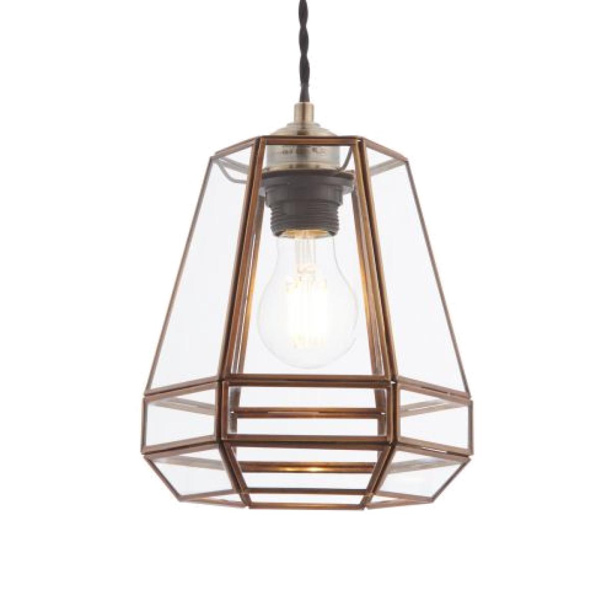 A glass pendant shade finished with an antique brass effect trim. This is a non electric pendant and should be teamed with a cable set. Compatible with LED lamps.