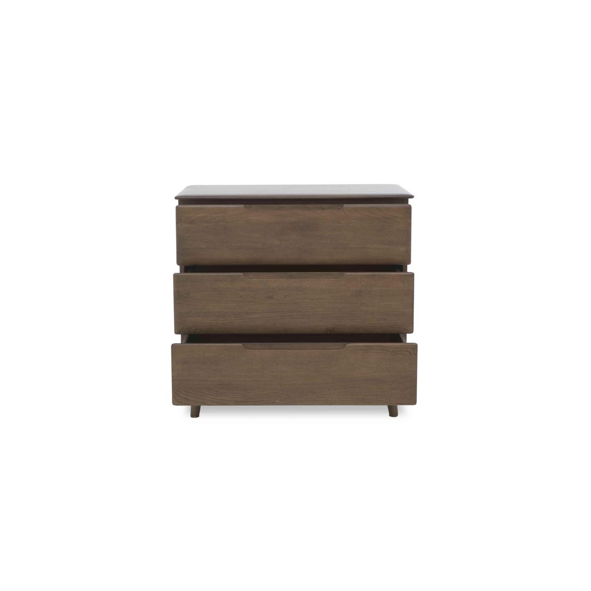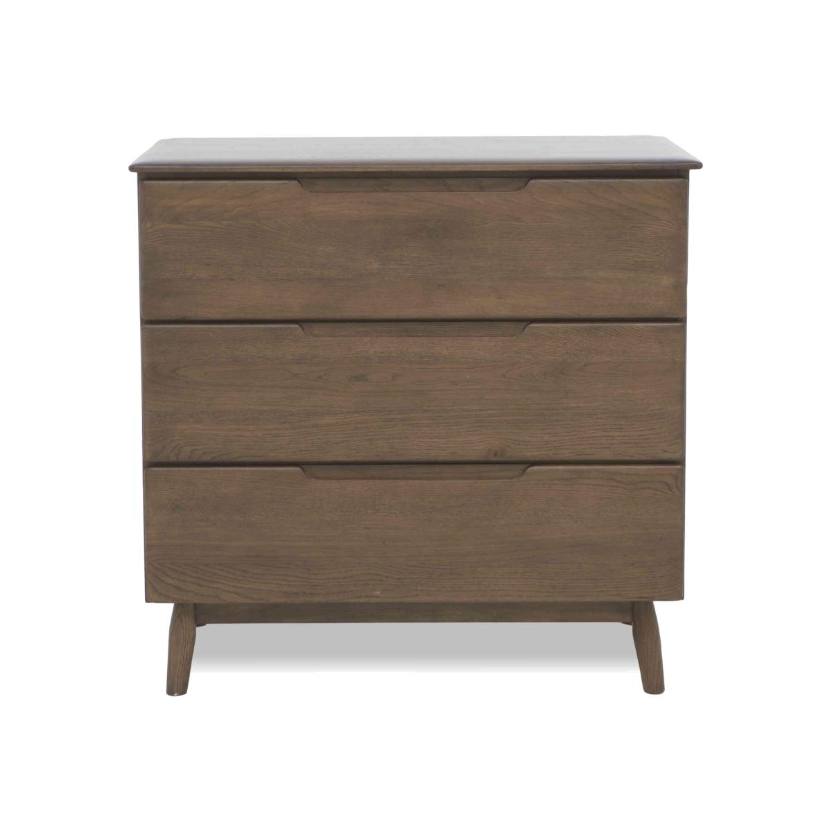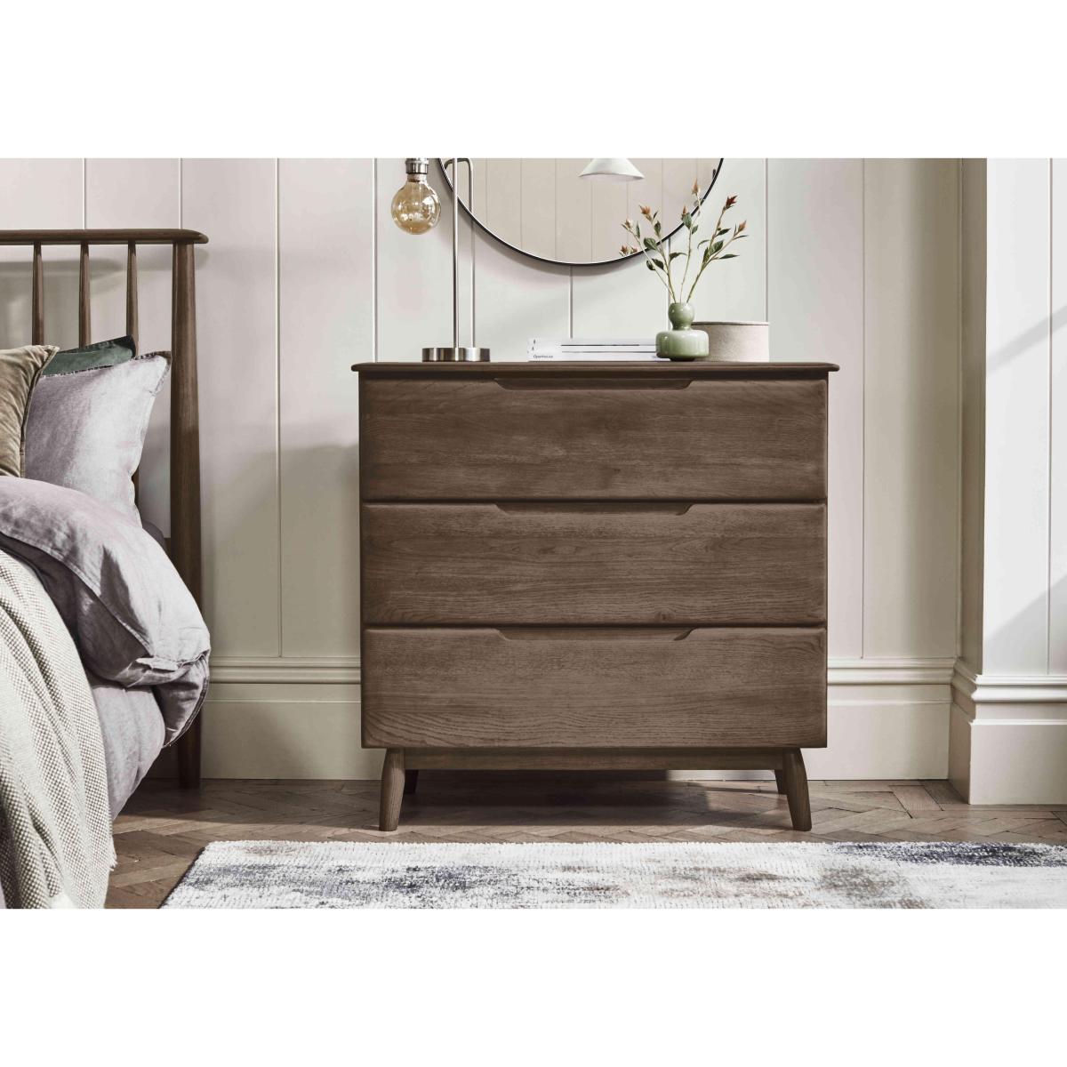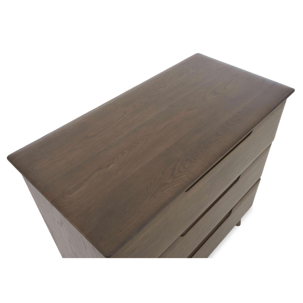 A contemporary interpretation of mid-century modern style, our handmade Stockholm bedroom furniture range stays true to its inspiration with recessed door and drawer handles, rounded splayed legs and a proliferation of gentle curves and rounded edges. It also offers a beautifully crafted oak and oak veneer finish in a choice of light or dark oak. Alongside a bed frame with a classic slim-spindled headboard, the range includes a wide choice of spacious and space-efficient storage pieces from bedside tables to chests of drawers to a perfectly proportioned two-door wardrobe, all designed with modern bedrooms in mind. The stylish Stockholm look is also available in dining and living room furniture. With its curved edges and rounded legs, everything about this spacious three-drawer oak chest of drawers is smooth and sophisticated. Why you'll love it Gently retro, this 3-drawer chest meets every need for storage with style. Contemporary mid-century modern style in oak and oak veneer. Choice of dark oak and light oak finish. Signature details include recessed handles, angled legs and smooth rounded edges. Easy-glide drawer runners. Arrives fully built – no self-assembly required. Handmade with care. This 3-drawer chest of drawers is part of the Stockholm bedroom furniture range. What you need to know Oak and oak veneer surfaces will show variation in colour. Knots, filled knots and other markings are to be expected. Avoid placing in direct sunlight or close to a heat source. We recommend using placemats and coasters at all times. Love the look? Be sure to browse our Stockholm dining furniture range too. WARNING!