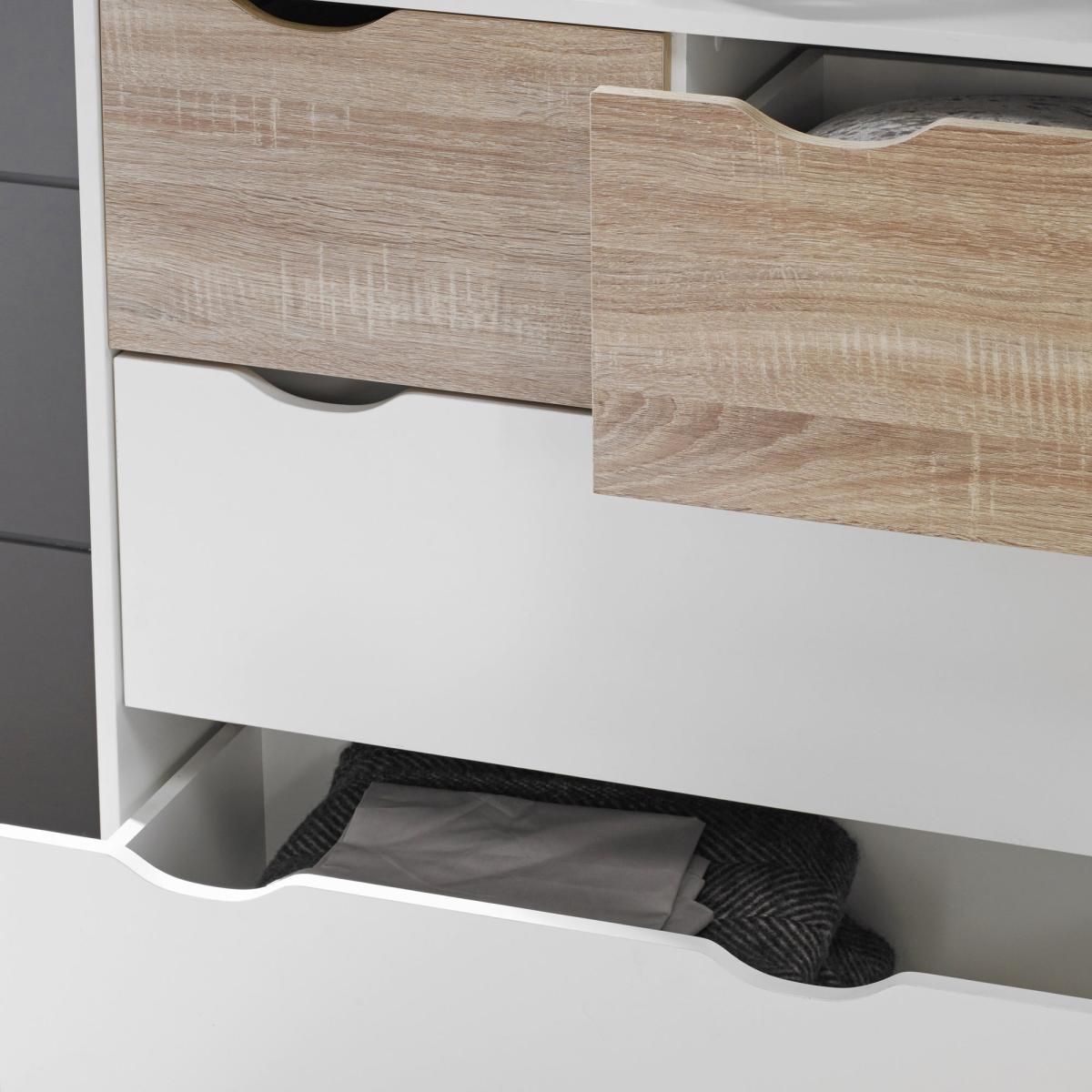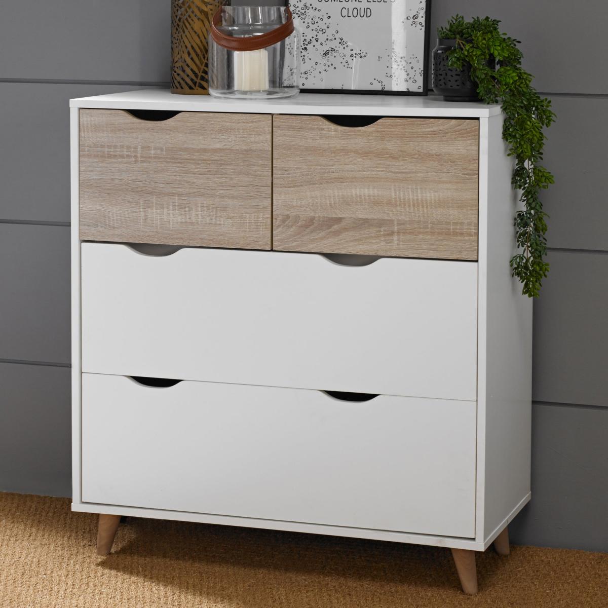 I’m a big fan of this 4-drawer chest for its clean lines and two-tone finish - the crisp white frame with oak-effect drawers feels fresh without being fussy. It slips effortlessly into Scandi, coastal or modern-farmhouse schemes and works just as well in a hallway as it does in a bedroom or home office, thanks to those slim, angled legs that keep the look light. For styling, mount a round mirror above and place a pair of simple ceramic lamps either side, then use a small tray or bowl for keys and everyday bits. Inside, you can easily organise linens, stationery or children’s art supplies, so surfaces stay clutter-free and the overall feel remains calm.