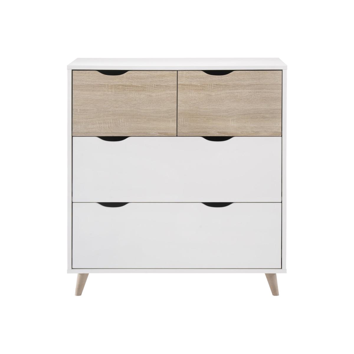* Matt white finish* Oak legs and smaller drawers* Integral handles* Fits into any room* Scandinavian style The Stockholm 4 Drawer Chest showcases a matt white finish with oak legs and integral handles. Its Scandinavian style fits effortlessly into any room. The smaller drawers provide functional storage while maintaining a sleek look.