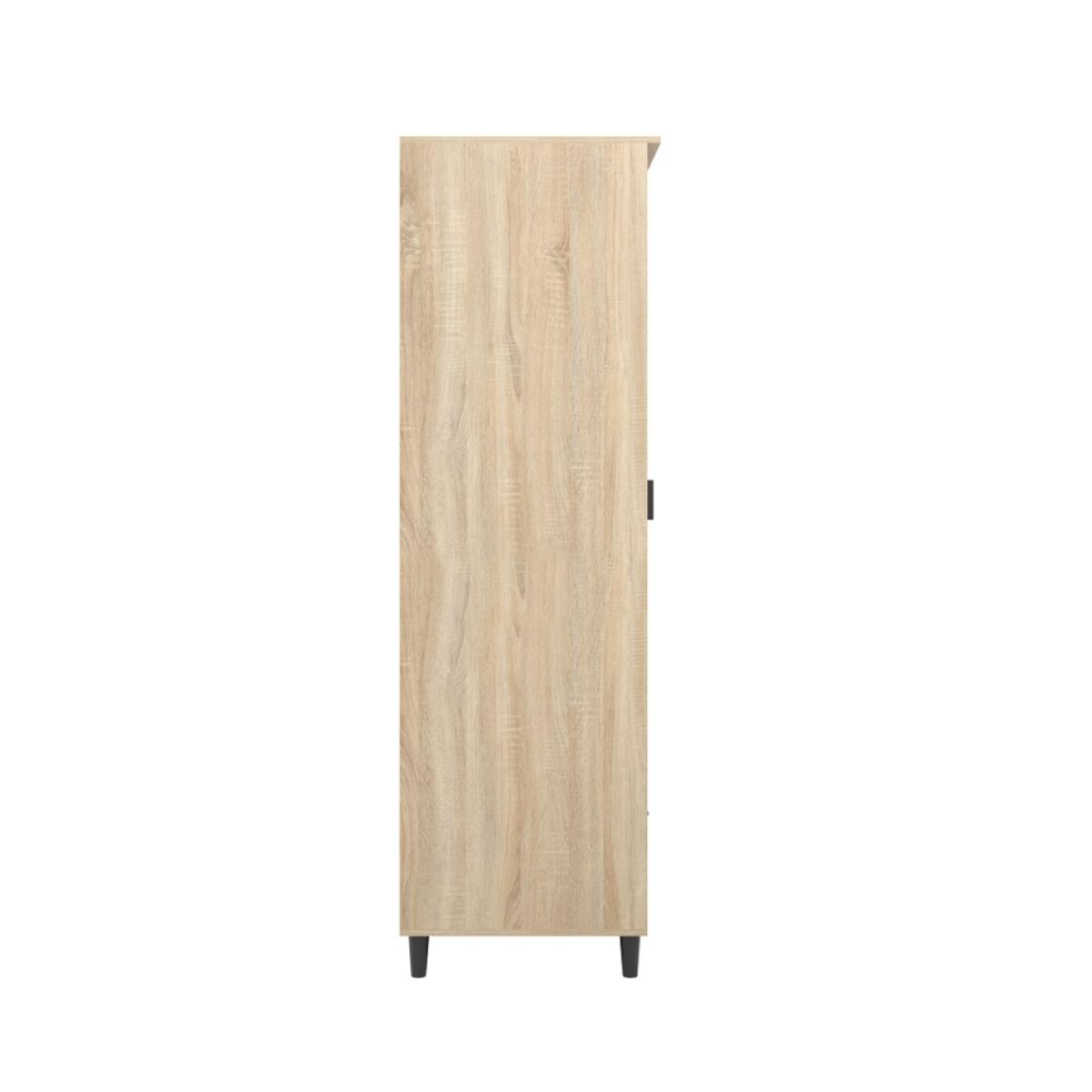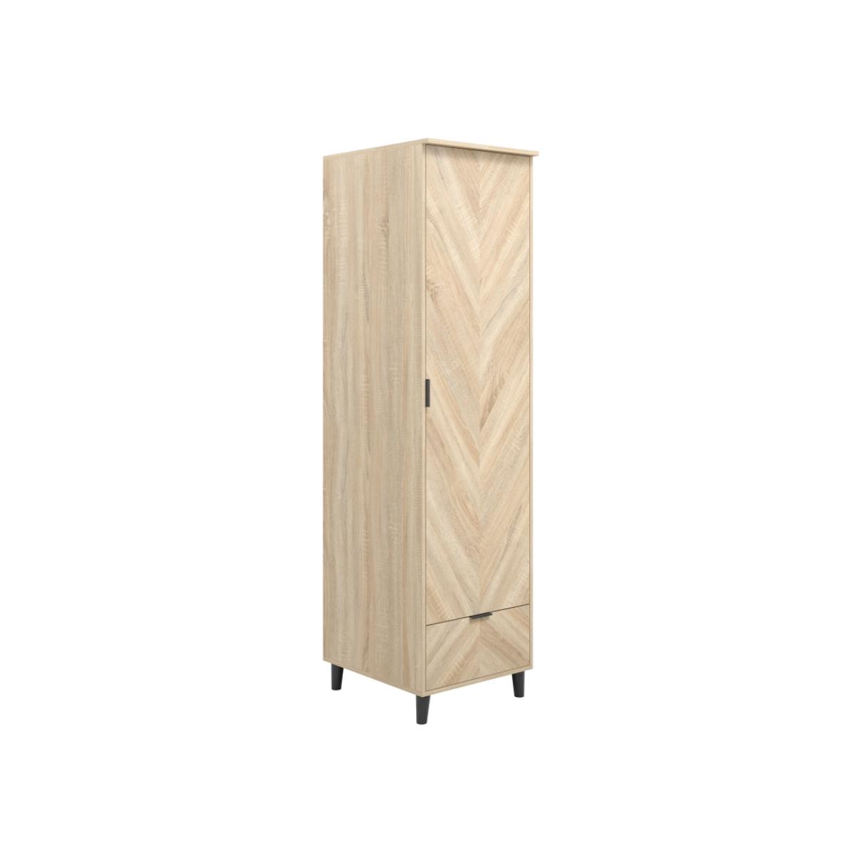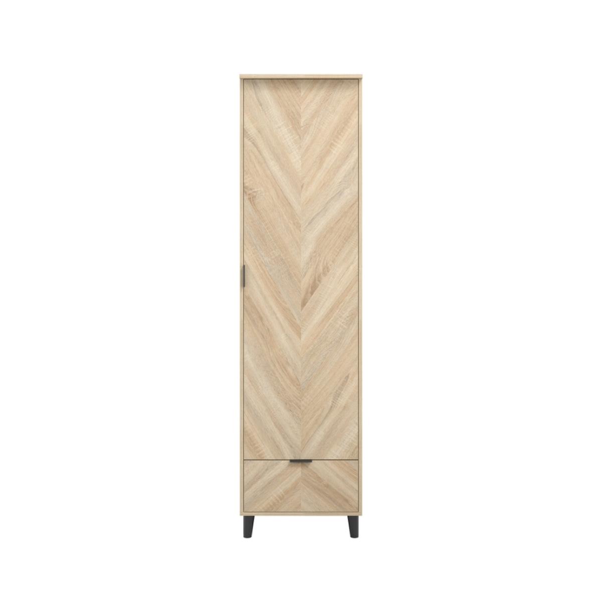 The Stockholm single wardrobe is a sleek storage solution that combines modern design with functional elegance. Compact yet functional, it's perfect for smaller spaces or as an accent piece in any room. Featuring a striking chevron pattern in Sonoma Oak, and integral handles, this wardrobe adds a touch of contemporary flair to any space. The matte black legs provide a subtle contrast, elevating its aesthetic appeal. With ample storage space and stylish design elements, the Stockholm wardrobe is the perfect addition to your bedroom or dressing area.