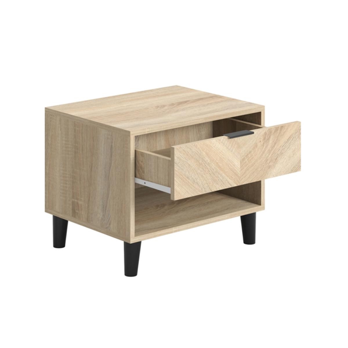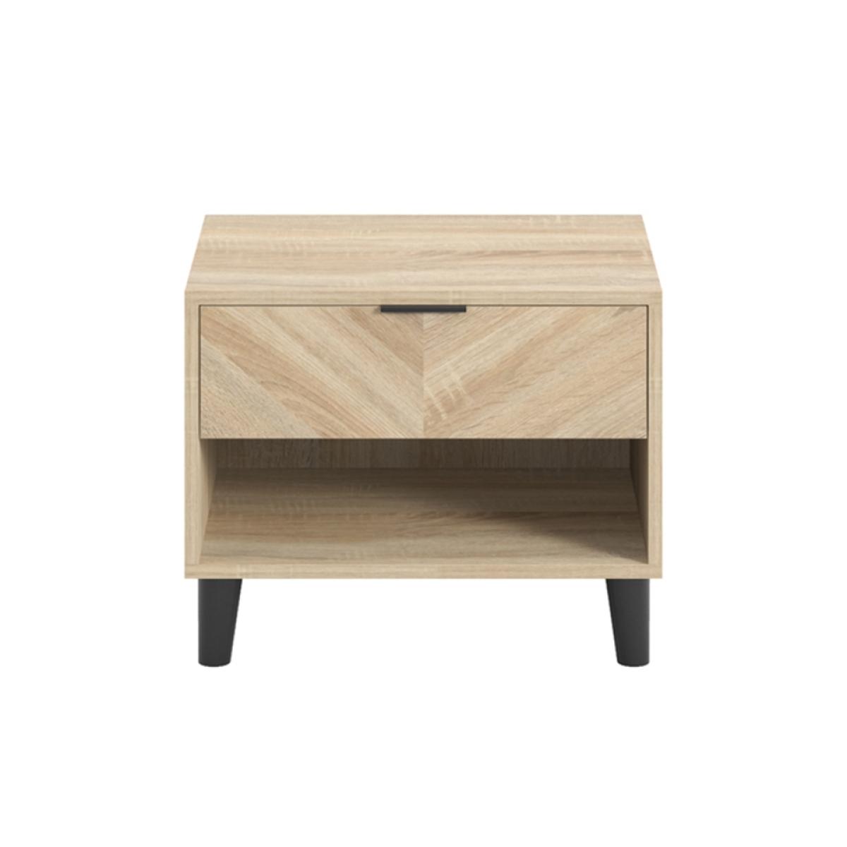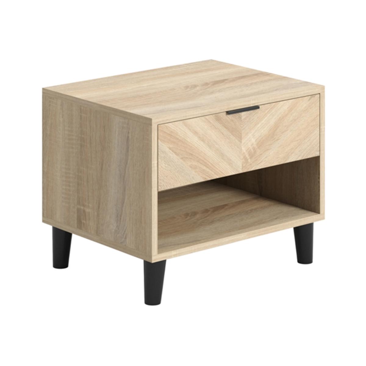 Introducing the Stockholm 1 drawer bedside cabinet, featuring a sophisticated chevron pattern and sleek black handles. Its Sonoma oak colour and black legs embody contemporary design, adding a touch of modern flair to your bedroom.