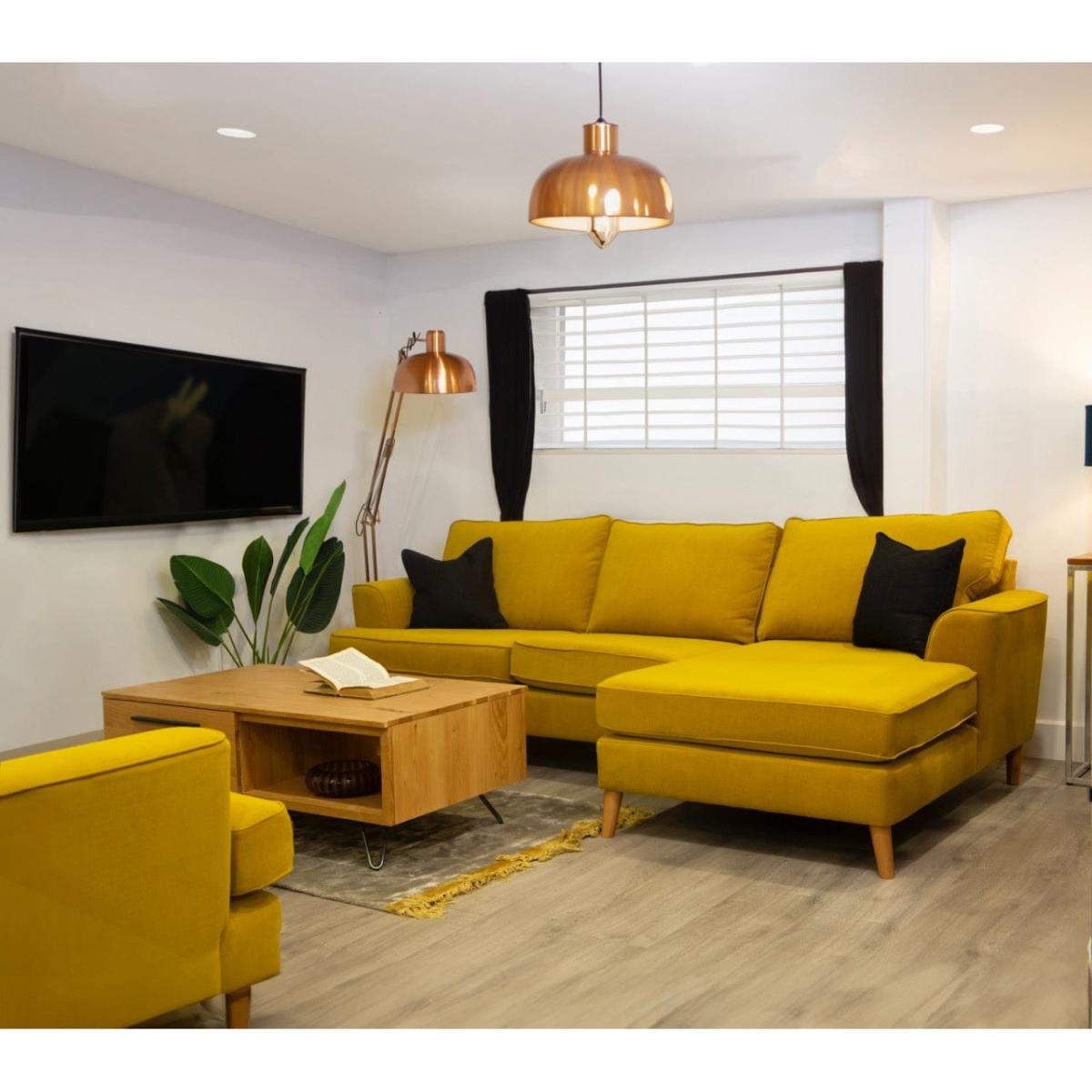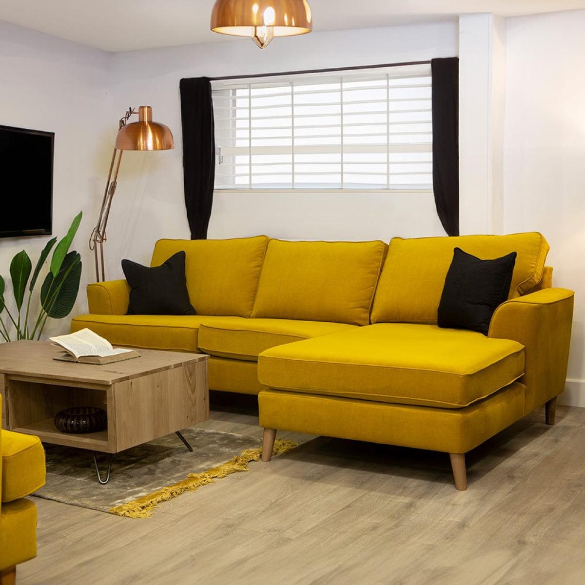 I love the bold ochre fabric of this corner sofa - it adds a vibrant focal point to versatile interiors. It's a great choice for modern, Scandinavian, or eclectic spaces where a splash of colour can uplift the overall scheme. Practical styling tips include pairing it with neutral or contrasting cushions, like greys or deep blues, to create visual interest. The fabric is relatively easy to work with for layered throws or accessories, and its compact corner design makes it ideal for both cosy living rooms or larger open-plan areas. To enhance its cosy appeal, consider adding a textured rug underneath and wall art that complements the warm tone, ensuring a balanced and inviting atmosphere.