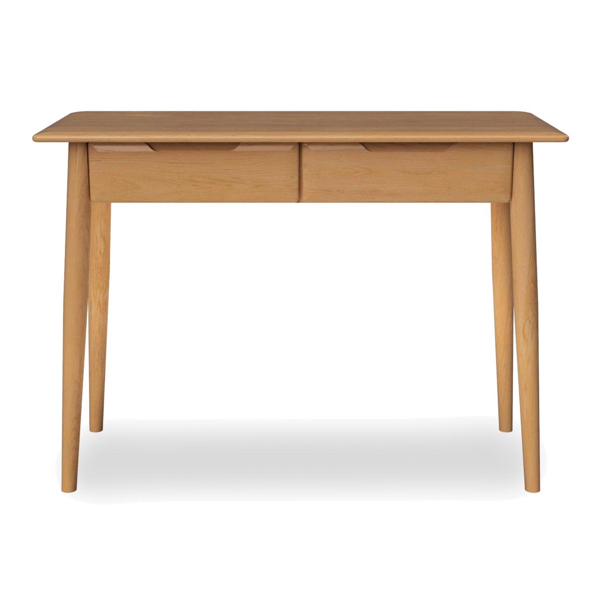 A contemporary interpretation of mid-century modern style, our handmade Stockholm bedroom furniture range stays true to its inspiration with recessed door and drawer handles, rounded splayed legs and a proliferation of gentle curves and rounded edges. It also offers a beautifully crafted oak and oak veneer finish in a choice of light or dark oak. Alongside a bed frame with a classic slim-spindled headboard, the range includes a wide choice of spacious and space-efficient storage pieces from bedside tables to chests of drawers to perfectly proportioned wardrobes, all designed with modern bedrooms in mind. The stylish Stockholm look is also available in dining and living room furniture. Get ready in chic retro style with the two-drawer Stockholm dressing table. Available in a choice of two oak finishes, it’s a lovely addition to any bedroom. Why you'll love it Contemporary mid-century modern style in oak and oak veneer. With 2 useful drawers, this dressing table is practical as well as beautiful. Choice of dark oak and light oak finish. Signature details include recessed handles, angled legs and smooth rounded edges. Easy-glide drawer runners. Arrives fully built – no self-assembly required. Handmade with care. This dressing table is part of the Stockholm bedroom furniture range. What you need to know Oak and oak veneer surfaces will show variation in colour. Knots, filled knots and other markings are to be expected. Avoid placing in direct sunlight or close to a heat source. We recommend using placemats and coasters at all times. Love the look? Be sure to browse our Stockholm dining furniture range too. Item code: STO-DRES-LO-001