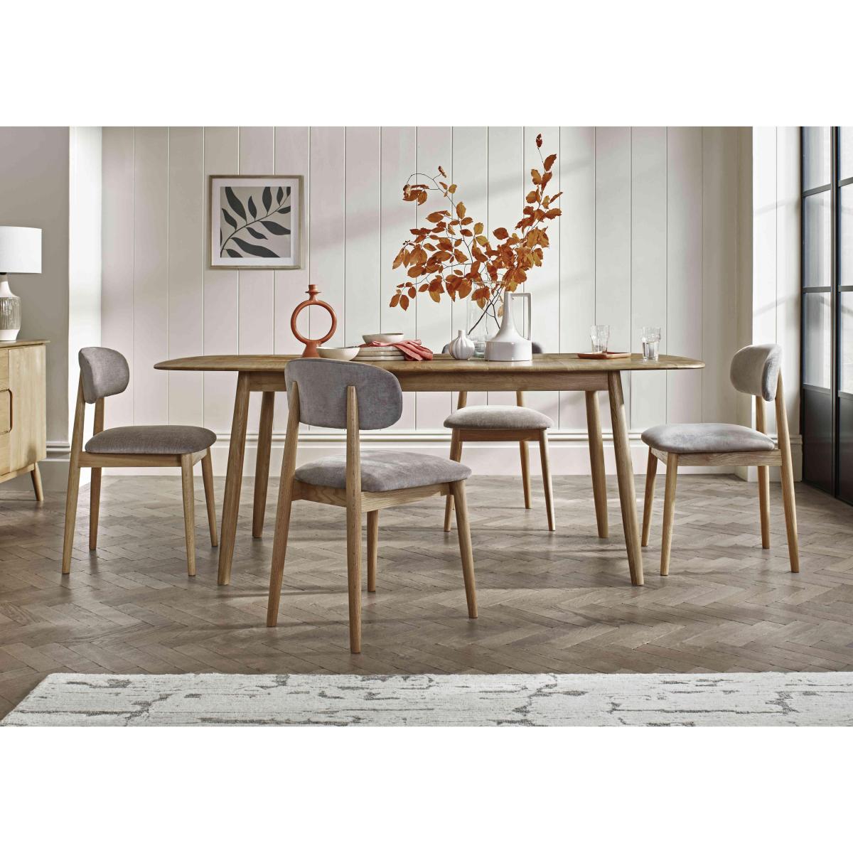 Mid-century modern design meets contemporary dining style in our Stockholm range of dining room furniture, living room storage furniture and occasional tables. With gentle curves, slender legs and recessed cupboard door handles, it’s a look that’s sure to stand the test of time. And handmade from solid oak and oak veneer, the craftsmanship is quite superb. This extensive collection includes a huge choice of dining sets that feature the range’s dining tables and dining chairs as well as stylish sideboards, TV cabinets and occasional tables. The Stockholm dining furniture range is exclusively available at Furniture Village. This timeless style is also available as bedroom furniture. With its classic curved ends and angled legs, this solid oak dining table is a faithful homage to mid-century furniture design – and looks fabulous in any contemporary setting. Why you'll love it This beautifully crafted extending dining table seats up to 8. Contemporary mid-century modern style in solid oak. Choose light or dark oak with a soft-sheen lacquer finish. Signature details include rounded-edge table top and angled legs. Simple butterfly extension mechanism – the extra leaf is hidden under the table top. Handmade with care. Exclusive to Furniture Village. This extending dining table is part of the Stockholm dining furniture range. What you need to know Seats 6 closed and 8 when extended. Made of solid oak. Variations in colour, filled knots and other markings are to be expected. Avoid placing in direct sunlight or close to a heat source. We recommend using placemats and coasters at all times. Love the look? Be sure to browse our Stockholm bedroom furniture range too.