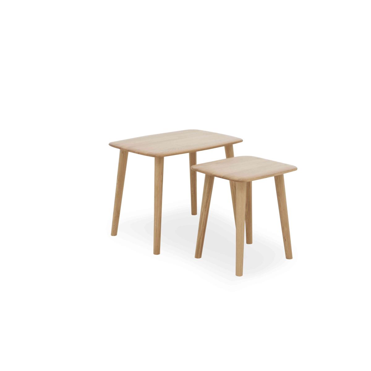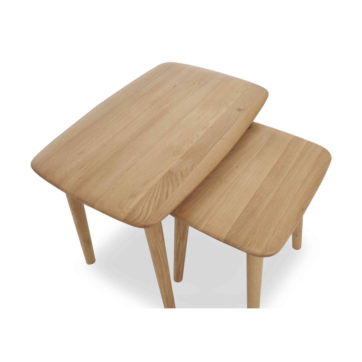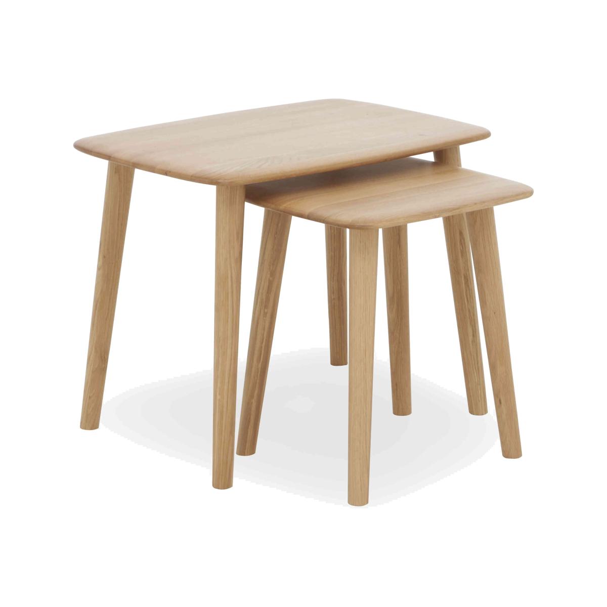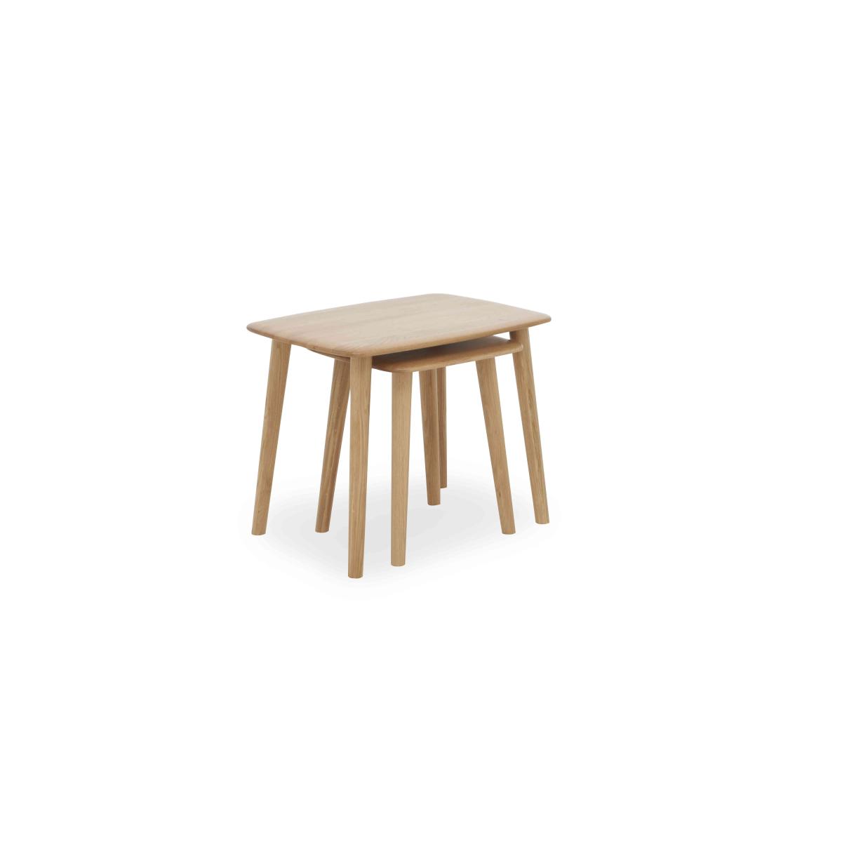 Mid-century modern design meets contemporary dining style in our Stockholm range of dining room furniture, living room storage furniture and occasional tables. With gentle curves, slender legs and recessed cupboard door handles, it’s a look that’s sure to stand the test of time. And handmade from solid oak and oak veneer, the craftsmanship is quite superb. This extensive collection includes a huge choice of dining sets that feature the range’s dining tables and dining chairs as well as stylish sideboards, TV cabinets and occasional tables. The Stockholm dining furniture range is exclusively available at Furniture Village. This timeless style is also available as bedroom furniture. Ever stylish and always useful, the classic nest of tables gets a mid-century style makeover in our Stockholm nest of tables. Handmade in oak and oak veneer. Why you'll love it This handy nest of tables comprises 2 rectangular side tables. Contemporary mid-century modern style in oak and oak veneer. Choose light or dark oak with a soft-sheen lacquer finish. Signature details include rounded-edge table tops and angled legs. Handmade with care. Exclusive to Furniture Village. This nest of tables is part of the Stockholm dining furniture range. What you need to know Oak and oak veneer surfaces will show variation in colour. Knots, filled knots and other markings are to be expected. Avoid placing in direct sunlight or close to a heat source. We recommend using placemats and coasters at all times. Love the look? Be sure to browse our Stockholm bedroom furniture range too.