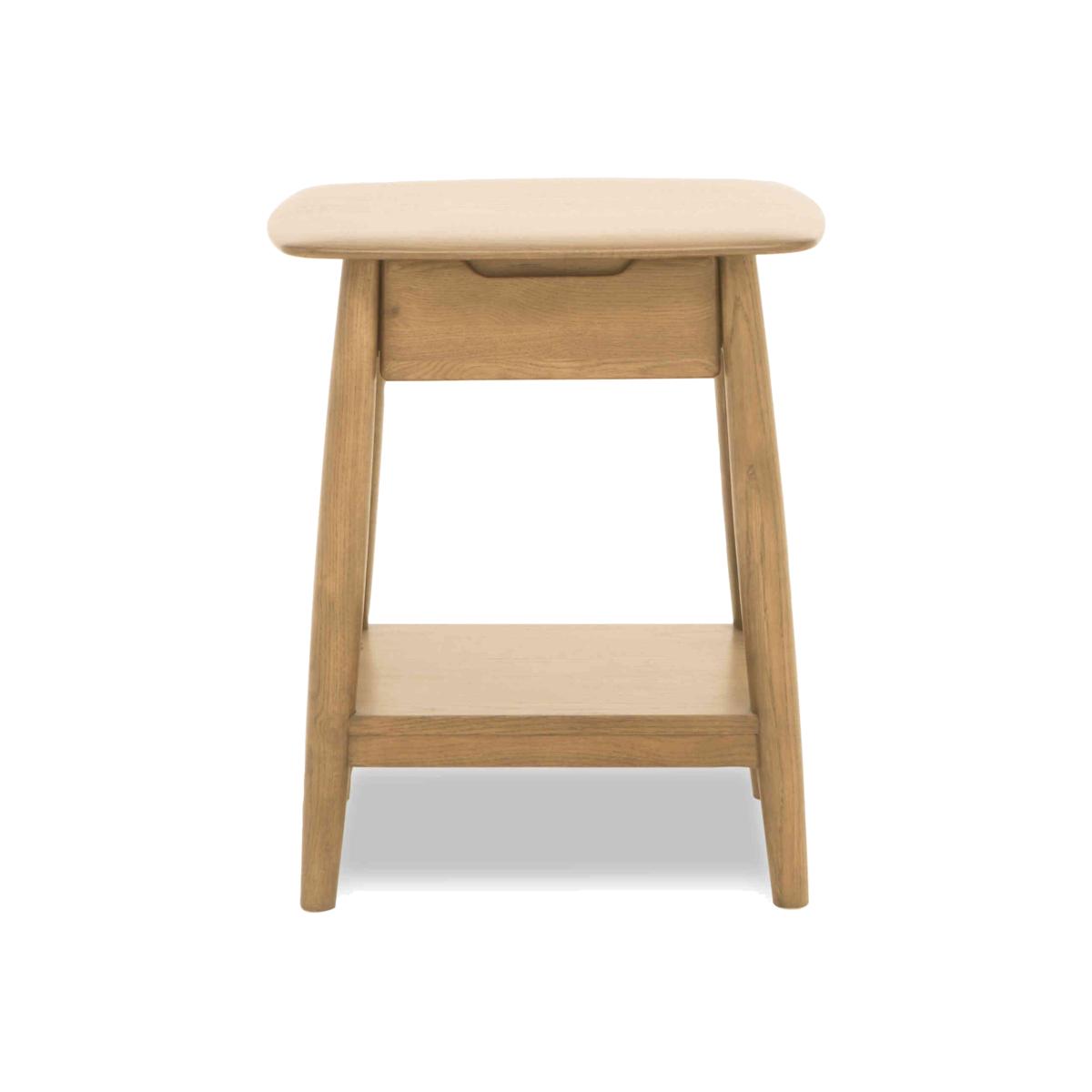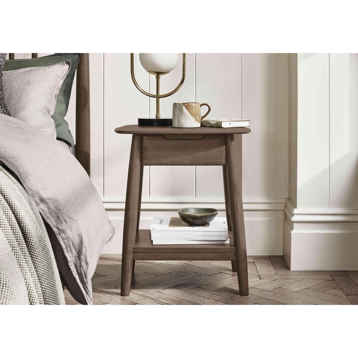 A contemporary interpretation of mid-century modern style, our handmade Stockholm bedroom furniture range stays true to its inspiration with recessed door and drawer handles, rounded splayed legs and a proliferation of gentle curves and rounded edges. It also offers a beautifully crafted oak and oak veneer finish in a choice of light or dark oak. Alongside a bed frame with a classic slim-spindled headboard, the range includes a wide choice of spacious and space-efficient storage pieces from bedside tables to chests of drawers to a perfectly proportioned two-door wardrobe, all designed with modern bedrooms in mind. The stylish Stockholm look is also available in dining and living room furniture. In a smaller bedroom this mid-century modern nightstand makes the perfect bedside cabinet. Simple and elegant, it has a useful drawer and a shelf. Why you'll love it This 1-drawer nightstand with a shelf also makes a handy living room end table. Contemporary mid-century modern style in oak and oak veneer. Choice of dark oak and light oak finish. Signature details include recessed handle, angled legs and smooth rounded edges. Easy-glide drawer runner. Arrives fully built – no self-assembly required. Handmade with care. This nightstand is part of the Stockholm bedroom furniture range. What you need to know Oak and oak veneer surfaces will show variation in colour. Knots, filled knots and other markings are to be expected. Avoid placing in direct sunlight or close to a heat source. We recommend using placemats and coasters at all times. Love the look? Be sure to browse our Stockholm dining furniture range too.