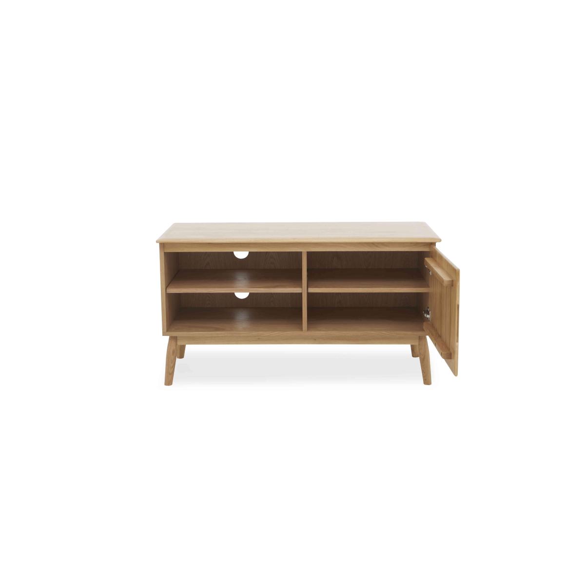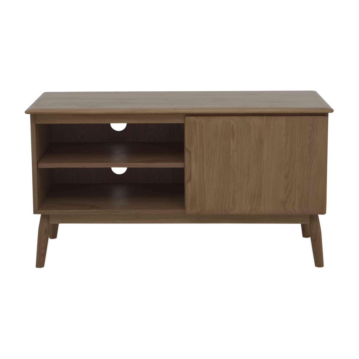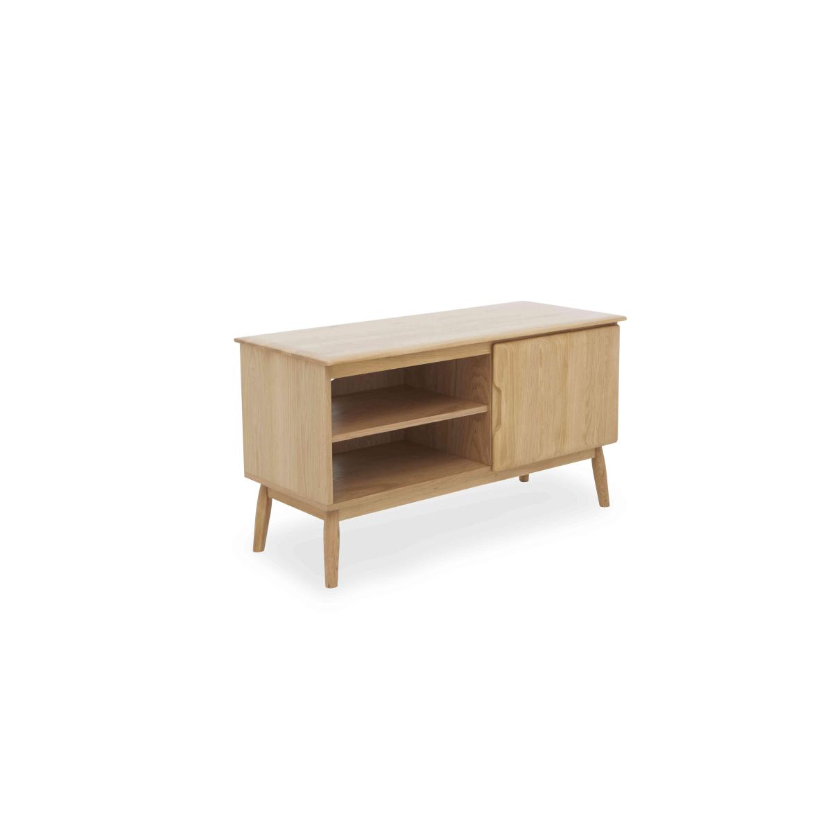 Mid-century modern design meets contemporary dining style in our Stockholm range of dining room furniture, living room storage furniture and occasional tables. With gentle curves, slender legs and recessed cupboard door handles, it’s a look that’s sure to stand the test of time. And handmade from solid oak and oak veneer, the craftsmanship is quite superb. This extensive collection includes a huge choice of dining sets that feature the range’s dining tables and dining chairs as well as stylish sideboards, TV cabinets and occasional tables. The Stockholm dining furniture range is exclusively available at Furniture Village. This timeless style is also available as bedroom furniture. This small TV cabinet is a stylish and functional piece for a more compact living space. There’s plenty of room for a large TV and it brings home plenty of mid-century modern design flair. Why you'll love it Small TV cabinet is perfectly formed and has plenty of storage. Contemporary mid-century modern style in oak and oak veneer. Choose light or dark oak with a soft-sheen lacquer finish. Signature details include the recessed handle, angled legs and smooth rounded edges. Soft-close cupboard door. Handmade with care. Exclusive to Furniture Village. This small TV cabinet is part of the Stockholm dining furniture range. What you need to know Cupboard has 1 fixed shelf. Oak and oak veneer surfaces will show variation in colour. Knots, filled knots and other markings are to be expected. Avoid placing in direct sunlight or close to a heat source. We recommend using placemats and coasters at all times. Love the look? Be sure to browse our Stockholm bedroom furniture range too. WARNING!