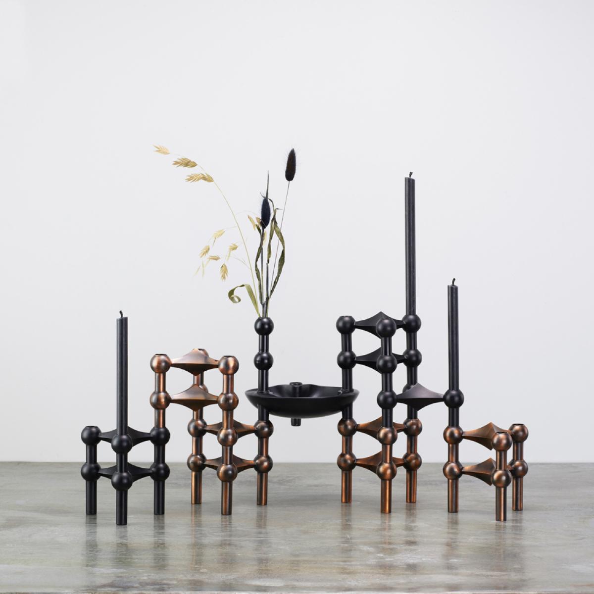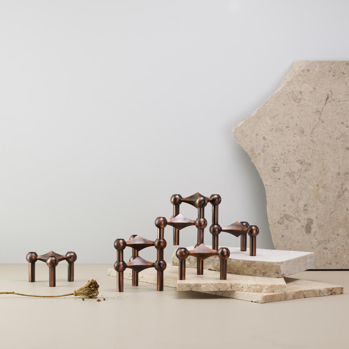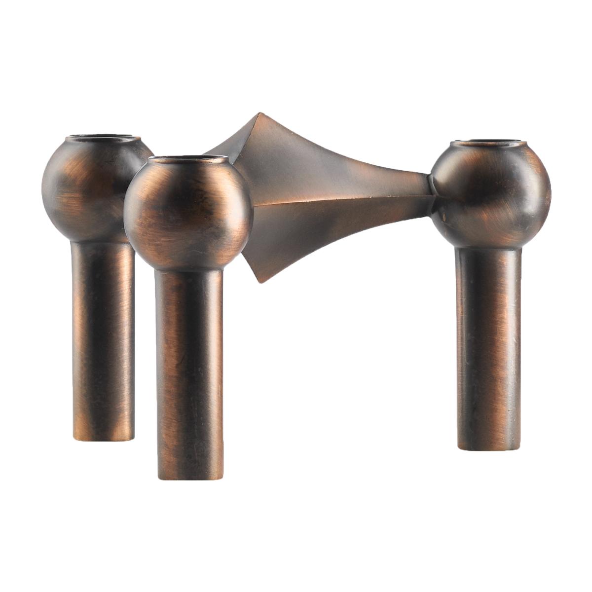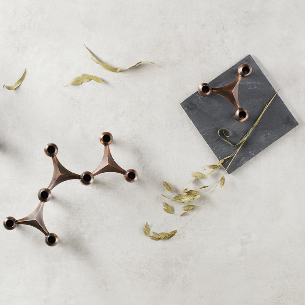 The STOFF Nagel candle holder is a true design classic that has now been re-launched by the Danish company STOFF Copenhagen. This new variant features a hand-painted antique finish in elegant bronze hues. Because each candle holder has been painted by hand, every single iteration of the piece is entirely unique. Across many years of time and use, the surface of the candle holder will acquire a beautiful patina to further accentuate the vintage feel and expressive charm of the piece. Nagel candle holders are especially intriguing as they can be arranged in many different ways: use the holders by themselves as a single stately candle, or you can place them together in a gorgeous ensemble. The original version was conceived by the illustrious designer duo Werner Stoff and Hans Nagel in the early 1960s. Hans Nagel came up with the idea for the unique shape and modular construction when he fell in the snow during a ski trip in the Alps. While down in the white, his fingers formed three imprints that his eyes came to connect in a distinctive three-pronged shape — the very form that would soon come to be the template for this iconic candle stick.