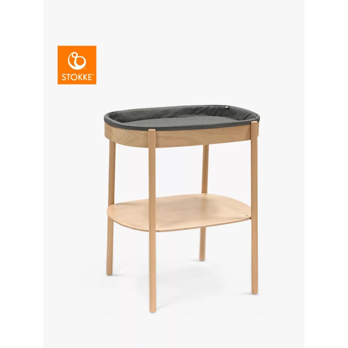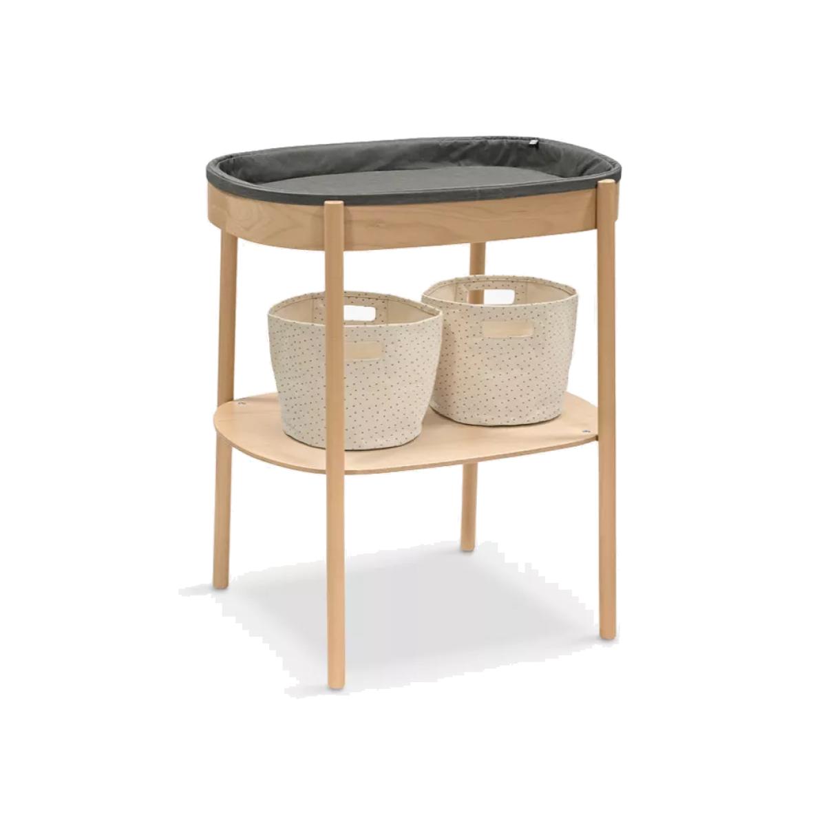 This changing table is the ideal height for changing your baby. It allows for sideways and parent-facing changing and the open space underneath allows you to stand closer to your baby. There's also an open shelf for storage. The unique oval design resembles the Stokke Oval crib (sold separately). Includes detachable cushioned changing pad.