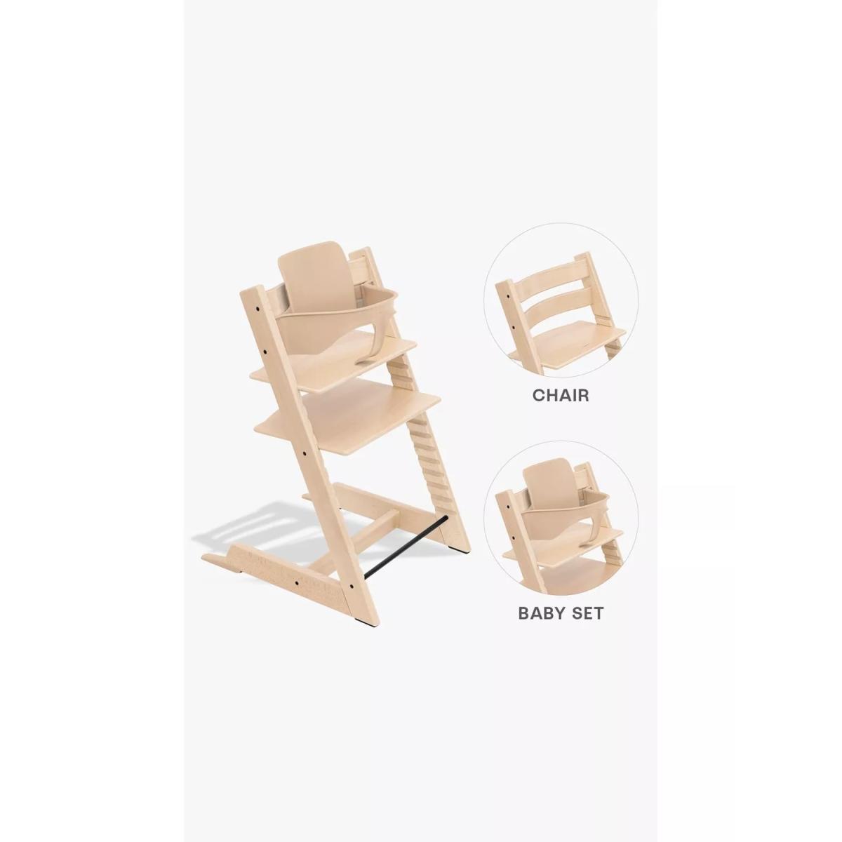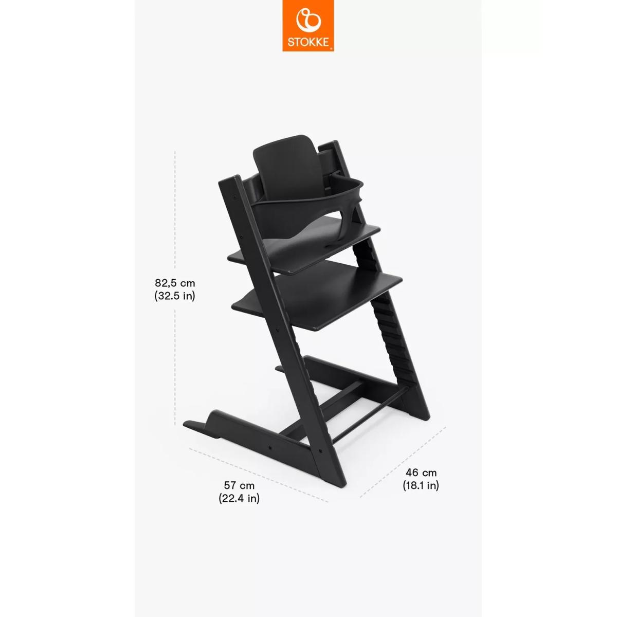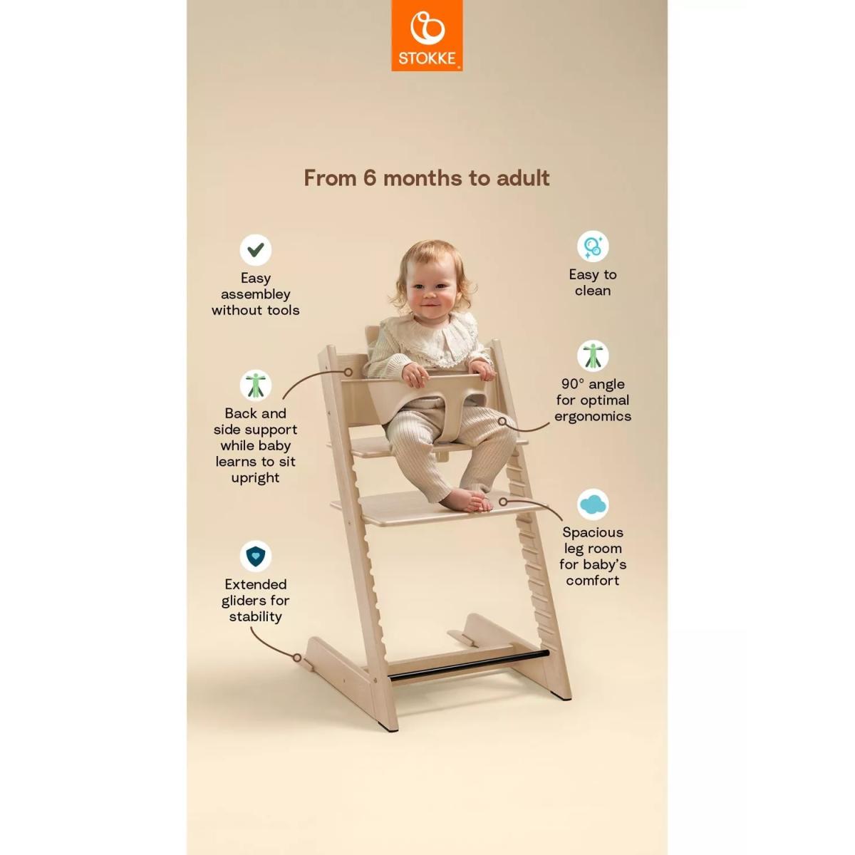 The chair that grows with the child™ - A Chair For Life. The Tripp Trapp® chair and Baby Set² is Stokke's 2-in-1 solution, bringing your baby to the dining table and closer to the family. It's the perfect starting point for parents seeking simplicity and practicality and includes everything you need to bring your child to the table in one box. Suitable from when your child can sit unaided (approx. 6 months), it grows with your child up to 3 years/15kg. It features both height and depth adjustable seat and footplates for ergonomics. The Baby Set² provides side and back support, allowing your little one to develop the skill of sitting. Easy to clean spills with a dampened cloth the finish on the chair is water-based, non-toxic paint. If combined with the optional Stokke® Harness² and/or Stokke® Tray (available separately) it complies with EN 14988:2017+A1:2020.