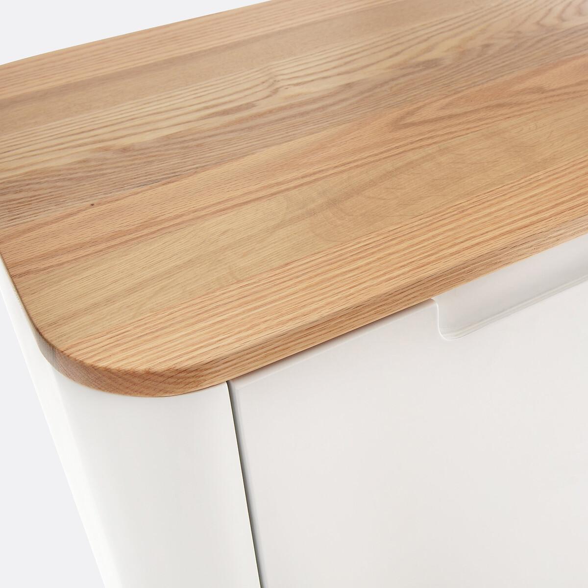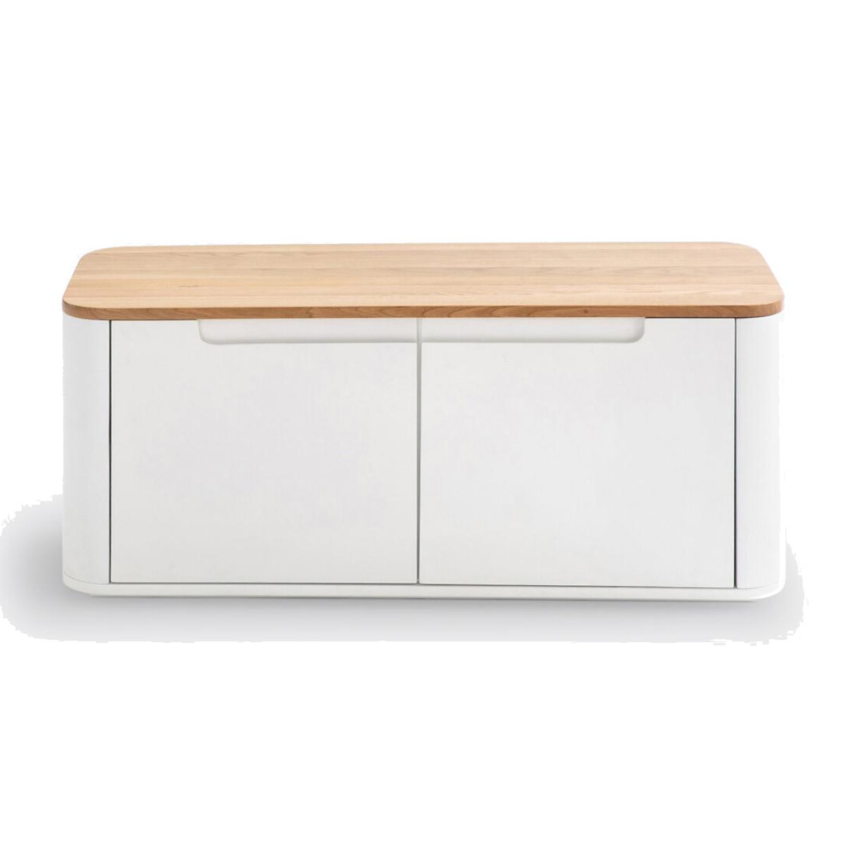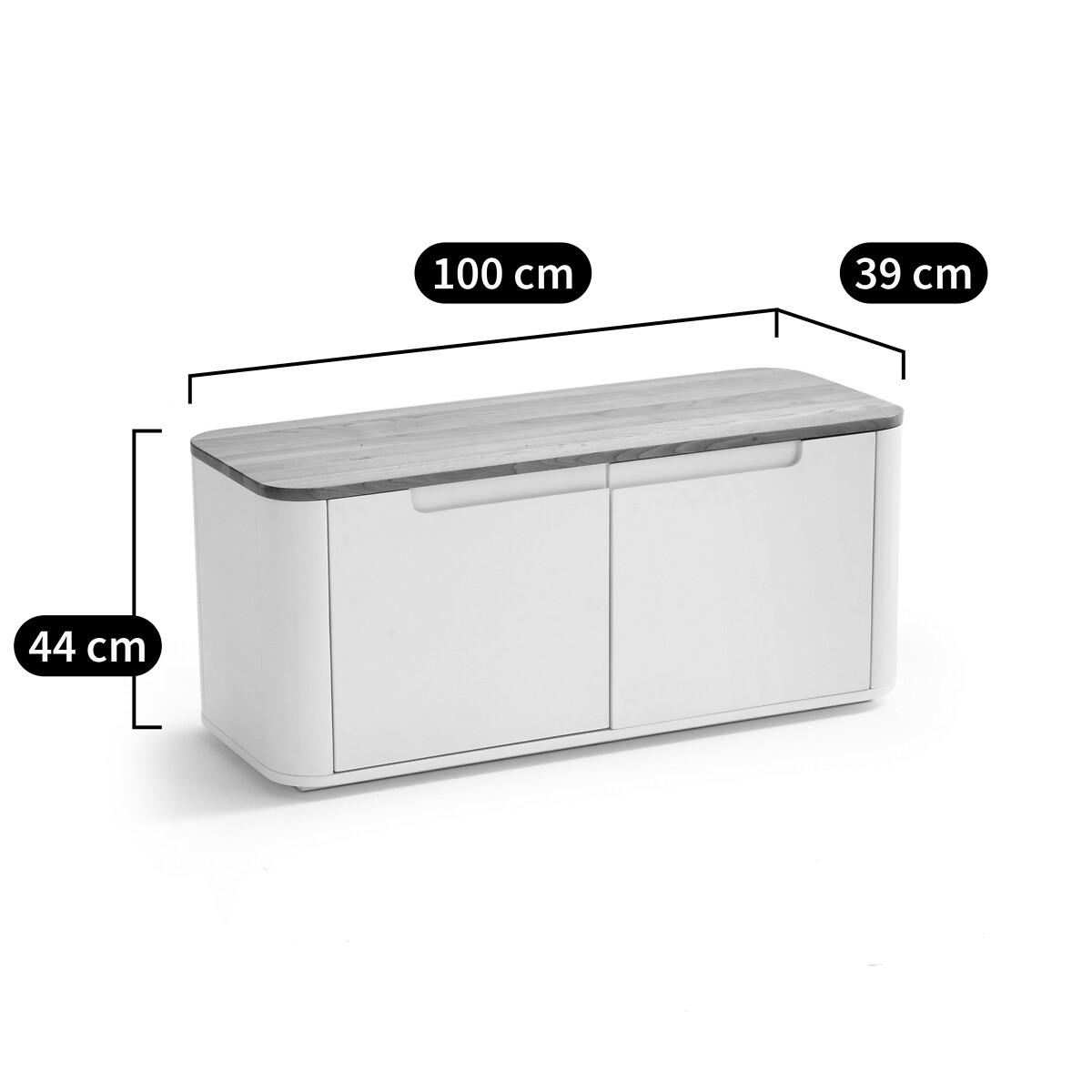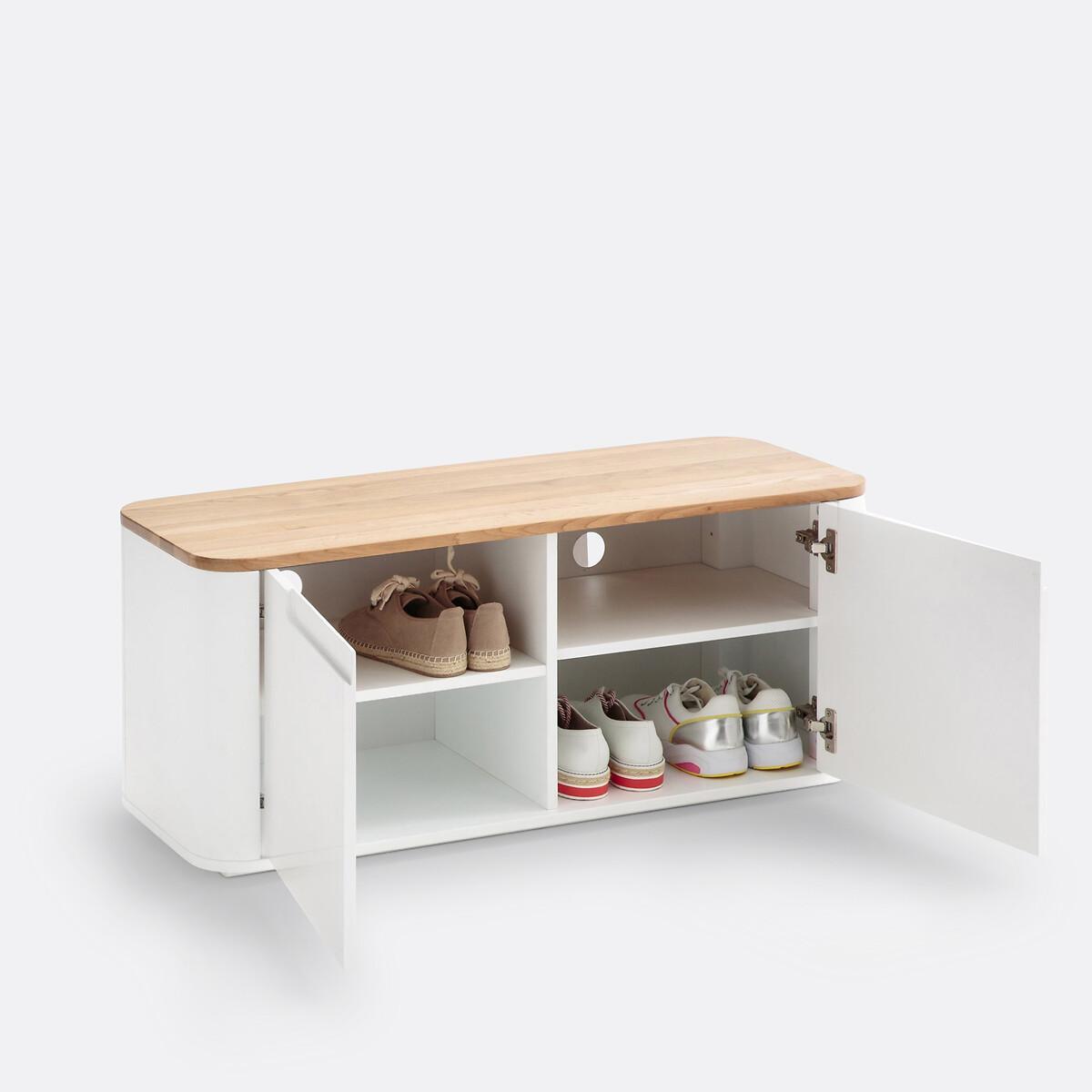 The Stolico storage bench. Very practical, contemporary and stylish, this bench adapts to many interior spaces. Product Details • 2 doors. • Inside: central partition with 1 non-adjustable shelf on the left, and 1 adjustable shelf on 3 levels on the right. • In white lacquered MDF, matte finish. • Top table in solid oak. • FSC® certified wood • 6 adjustable plastic feet. Dimensions. Total: • Length 100 • Depth 39cm • Height 44cm. Delivery:This product requires assembly. Available for home delivery. Note! Please check that all access points are large enough to accommodate your delivery (doors, stairs, lifts). • WOOD FROM SUSTAINABLY MANAGED FORESTS. FSC® certified wood comes from forests that are environmentally, socially and economically well managed. Parcel dimensions and weight:1 parcel • L108 x D49 x H23 cm. • 33kg