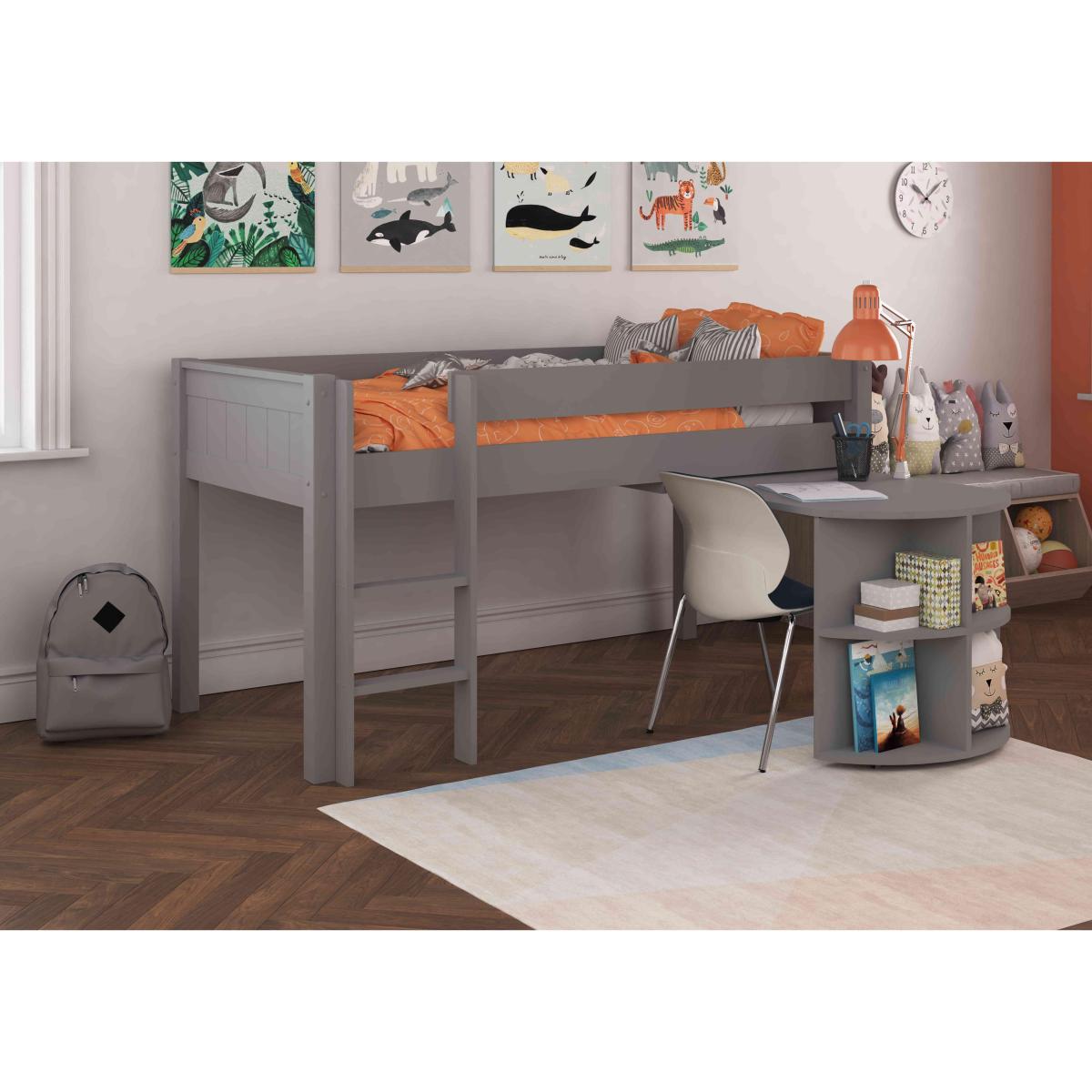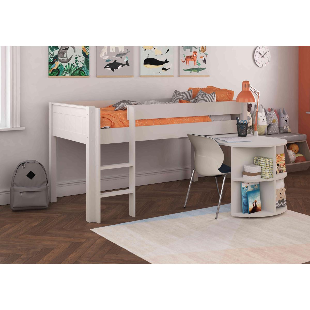 Your kids will love the Chase range from Stompa. It perfectly blends sturdy and functional with fun and exciting, plus it’s rigorously tested against all relevant safety standards, so you’ll have complete peace of mind. With its attractive tongue and groove design and clean, neutral style, the Chase range will easily fit into any child’s room and is suitable from the age of 6 through to teen years, depending on your child’s individual development. All Stompa products are top-quality, so you can be confident it will last for years. Offering sleep and study space in one neat package, this mid-sleeper bed with a pull-out desk is perfect for early teens bedrooms. Why you'll love it Versatile and hardwearing, this mid-sleeper bed with pull-out desk is built to last. Available with either a white or grey lacquered finish. Features a handy pull-out desk for homework or arts and crafts. Flat steps on ladder for comfort and safety. Attractive tongue and groove effect on headboard and footboard. Constructed with a solid pine frame. Rigorously tested against all relevant safety standards. Quality furniture at a great value price. Part of the Stompa Chase range at Furniture Village. What you need to know This bed takes a standard sized mattresses 90x190 cm with a maximum depth of 155 mm We offer a range of Stompa mattresses to fit online. Heavy duty construction. Durable lacquered finish. From Stompa, a name you can trust.