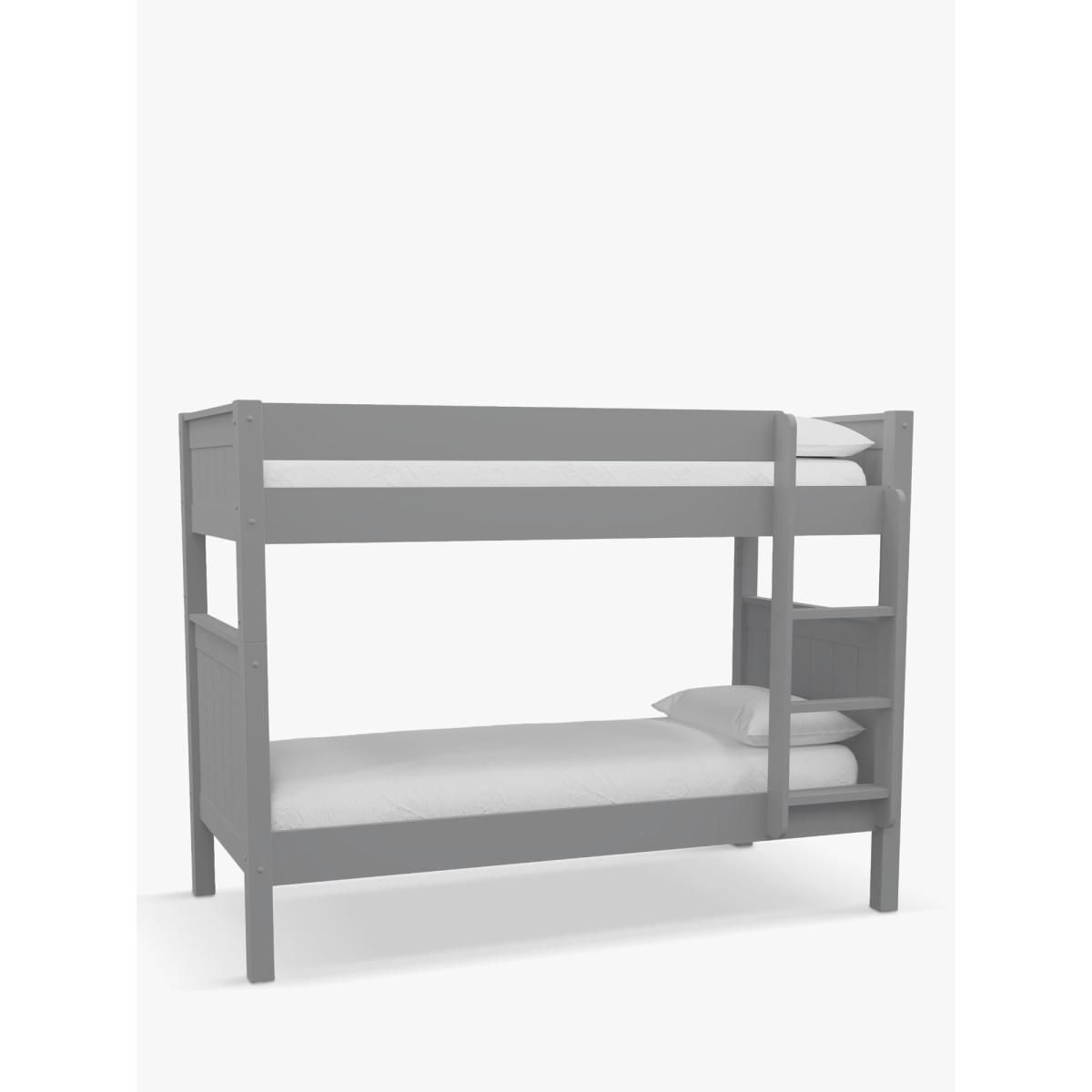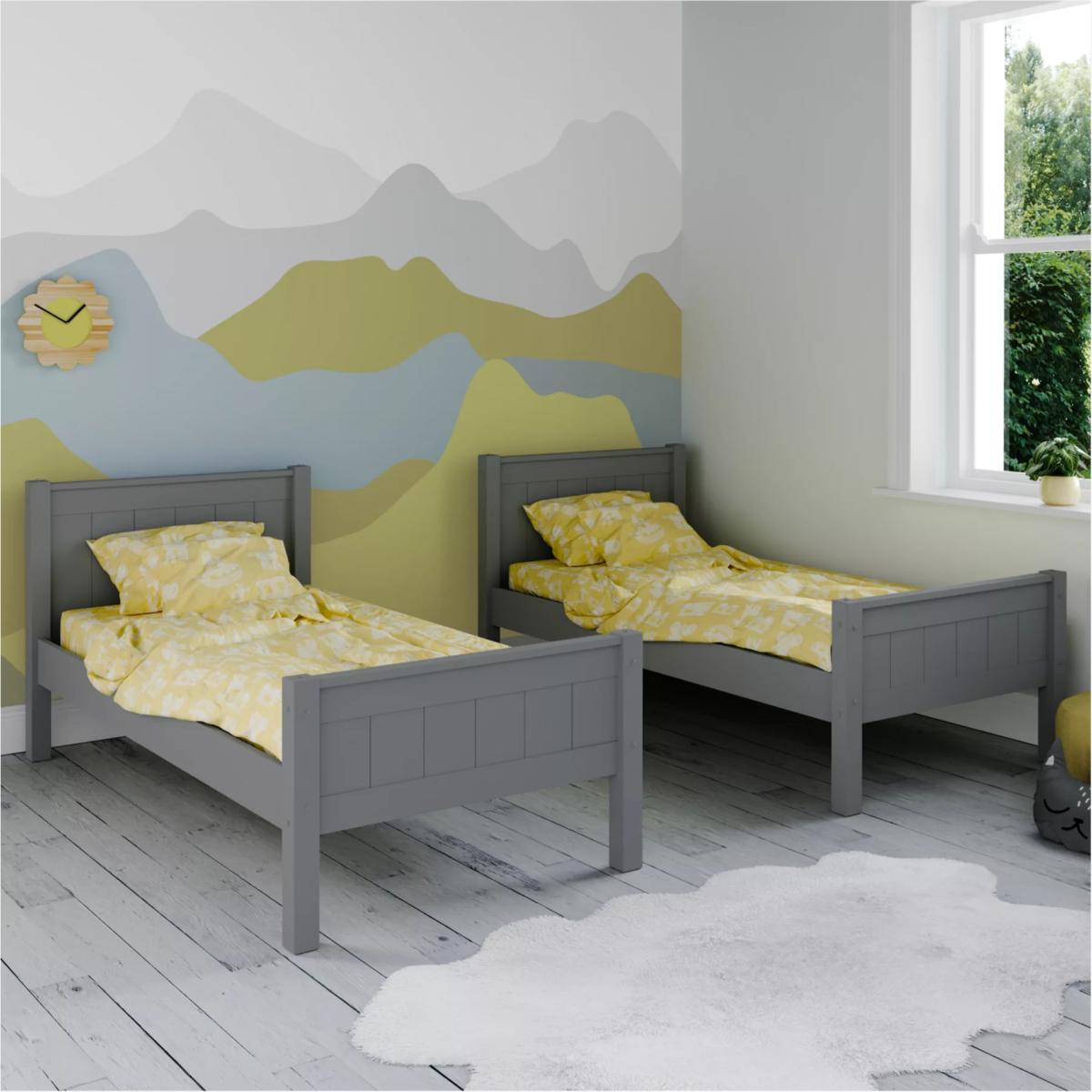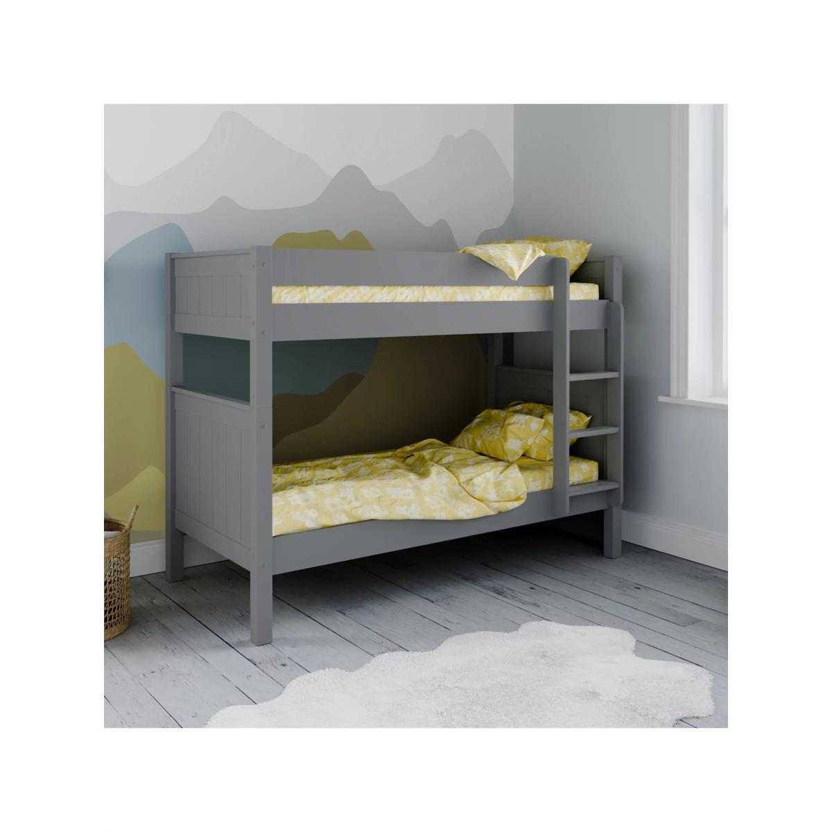 I’m a fan of how this classic frame’s clean lines and panel detailing sit equally well in modern or Scandi-inspired schemes. The muted grey finish gives you a neutral base for bright bedding or a monochrome look, and its solid build means you can use it as a stacked bunk or split into two singles. For practical styling, layer in patterned throws and cushions, add under-bed storage boxes for toys or books, and consider a simple mural or wallpaper behind to inject personality without overwhelming the space.