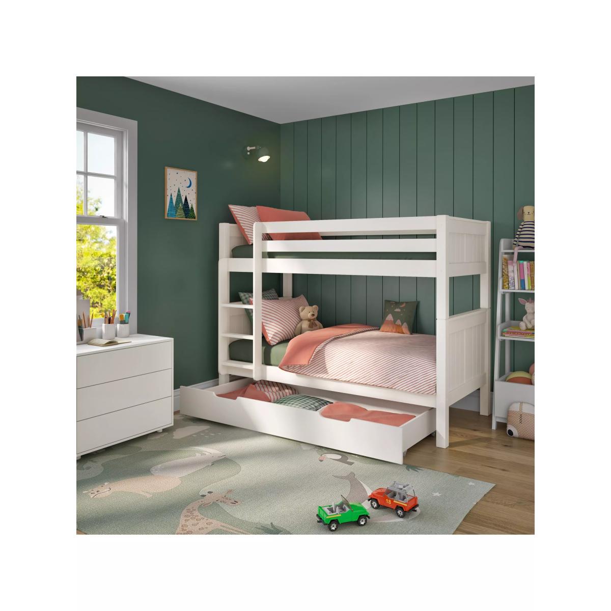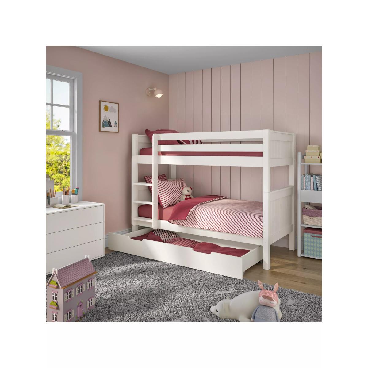 Perfect for shared bedrooms, or maximizing available space, this bunk bed provides two comfortable sleeping areas without compromising floor space as well as a full-length trundle drawer for storage. A timeless and functional choice for shared spaces, it's crafted with quality and care, showcasing an updated design with two safety rails, providing extra security and allowing for a maximum mattress depth of 20cm on the top bunk. Key Features: Classic Design:this bunk bed boasts a timeless design that blends seamlessly with any interior style, ensuring longevity and versatility. Sturdy Construction: crafted from durable materials, this bunk bed is built to withstand the demands of active kids while maintaining its structural integrity. Two Safety Rails: designed with two safety rails on the top bunk, providing extra security and peace of mind for parents. FSC Certified: made from FSC-certified and managed forest materials, emphasising Stompa's commitment to sustainable and responsible sourcing. Trundle Drawer: the included trundle drawer offers useful additional storage space. Mattress Size: takes two UK standard single mattresses (190cm x 90cm), perfectly fitting the bunk bed's design and functionality. Versatile Configuration: this bunk bed offers flexibility in configuration, allowing it to be assembled as two separate single beds if needed, adapting to changing needs.