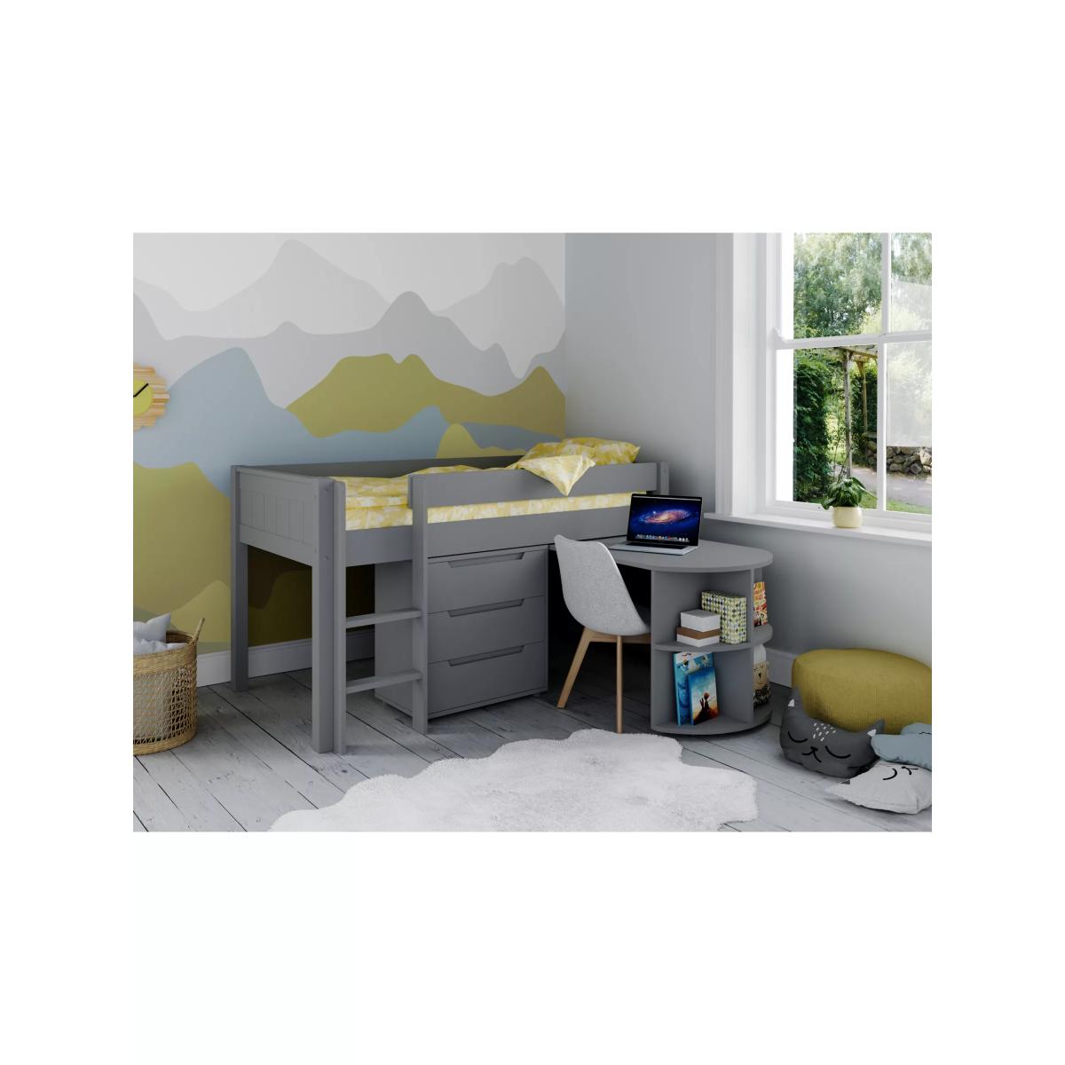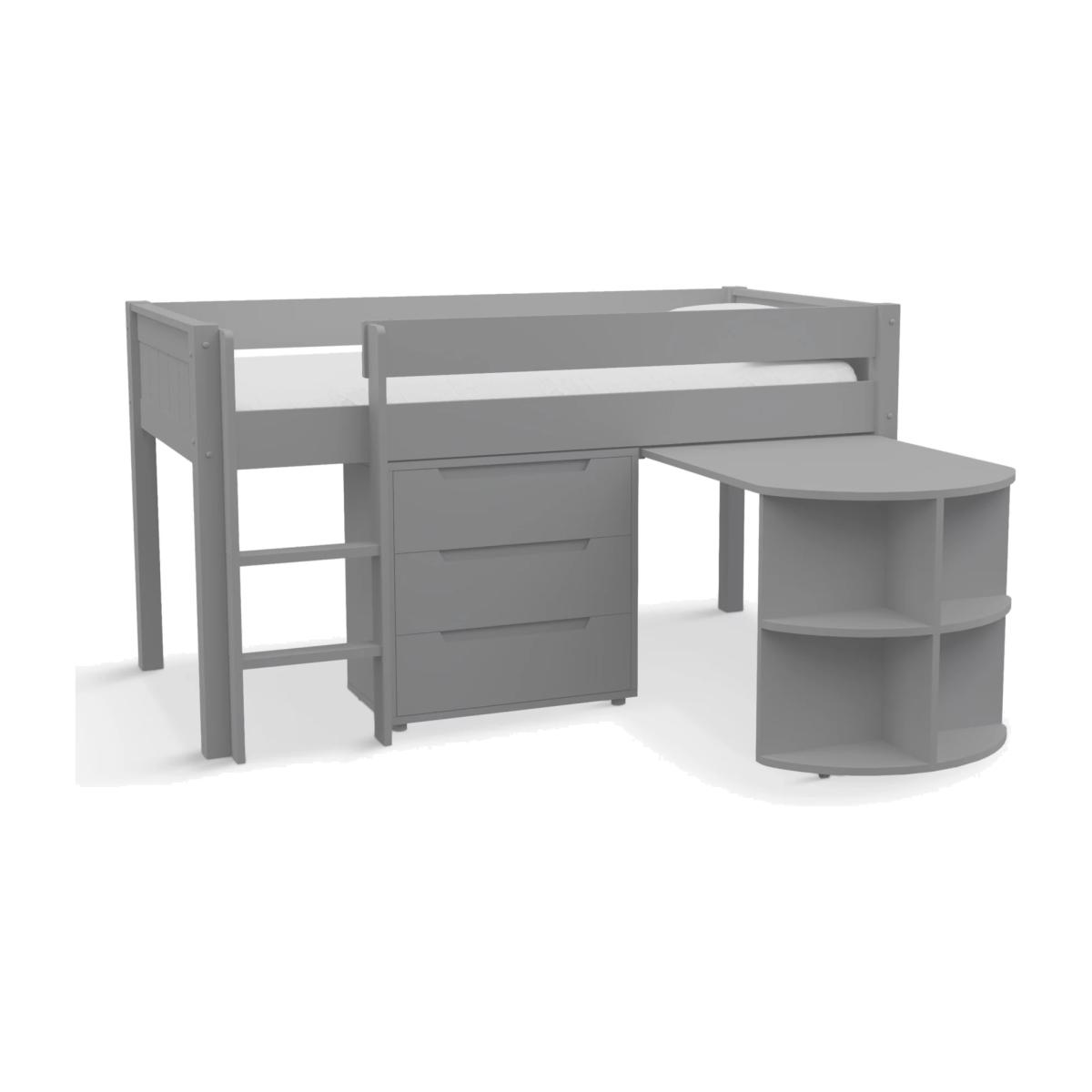 Sleep, store and study in the space of just one bed! The ultimate space saver, this mid-sleeper has a pull out desk and a 3 drawer chest. It can easily be adapted to suit a boy's or a girl's bedroom and is great for homework and hobbies. It features an attractive tongue and groove effect in the headboards and footboards. The neat fitted appearance of this bed conceals a useful storage area under the bed for bulky things such as suitcases or maybe even just lots of pillows for a secret den area. Built to last, the bedframe is produced in solid pine and MDF featuring solid pine slats, ensuring sturdy, long-lasting quality. The pull-out desk and 3 drawer chest are produced from hardwearing MDF. This classic mid-sleeper bed takes a standard UK single mattress(maximum depth 15.5cm)