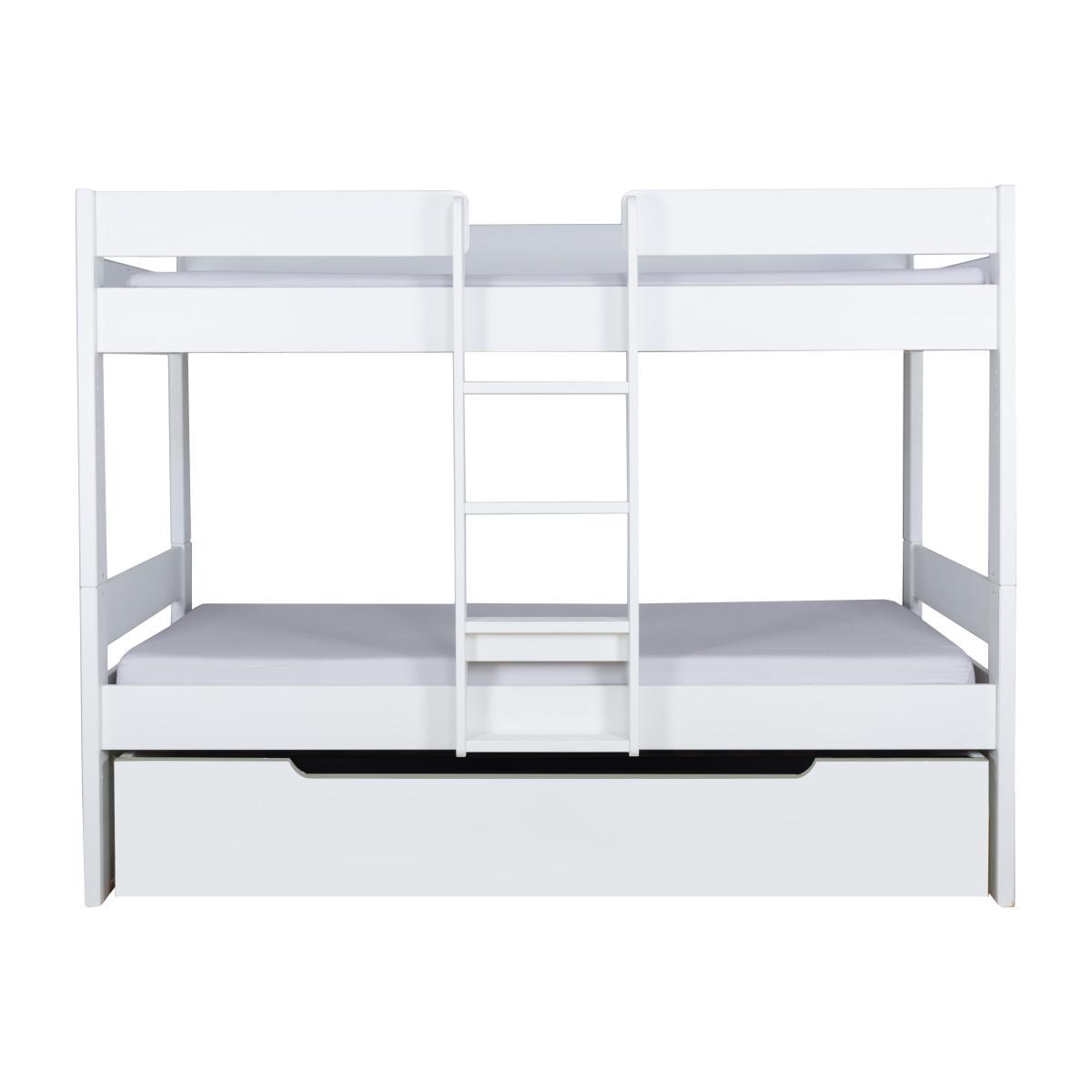 If children designed bedroom furniture, they’d surely come up with the Stompa Nexus collection. This high-quality modular range offers stylish and well-crafted places to sleep, study and store. Grownups will love the compact, space-saving solutions like pull-out desks and under bed chests of drawers, the Scandi-cool white and grey colour palette, and the hypoallergenic mattresses. Kids will love the huge choice – mid-sleeper, high-sleeper or bunk bed? – as well as the integrated shelves and storage cubes tailor-made for all their favourite things. Featuring Furniture Village-exclusive door colours, the Stompa Nexus range is cleverly engineered, solidly constructed and rigorously safety-tested. A bunk bed that sleeps three? The Stompa Nexus bunk bed with trundle is the compact multi-sleeper that makes sleepovers super easy. Beautifully constructed from white-painted solid pine, this ergonomically-designed bed has a stylish central ladder – which adds to the cool and contemporary Scandi look – and a trundle bed which smoothly rolls out from under the lower bunk on castors. The bunkbed also easily converts into two identical single beds. Bed bases are slatted; mattresses sold separately. Fits 90cm x 200cm Mattress Only. Designed for children and loved by parents, the Stompa Nexus bunk bed with trundle is part of the Stompa Nexus collection. The range includes a wide range of mid-sleepers and high-sleepers as well as bunk beds, modular storage units and freestanding bedroom furniture. The Stompa Nexus Bunk Bed with Trundle requires three mattresses. The bunk bed takes two continental size single mattresses (90 cm x 200 cm). The mattress on the top bunk should not, for safety reasons, exceed a depth of 15 cm. The trundle bed takes a standard single mattress (90 cm x 190 cm) which should not exceed a depth of 16 cm.