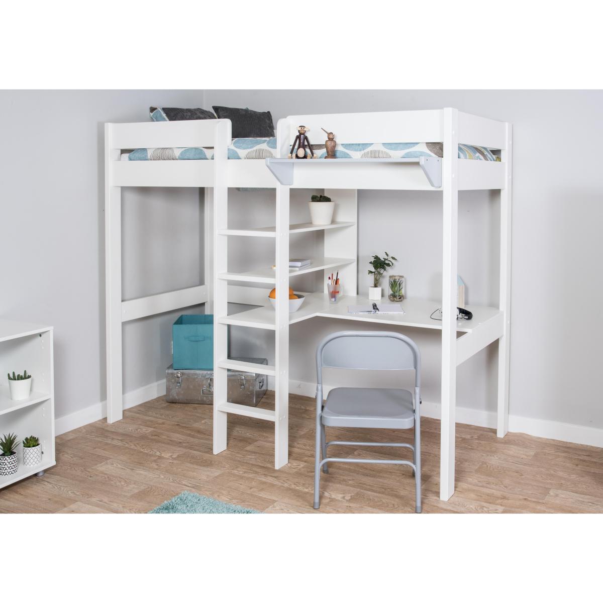 If children designed bedroom furniture, they’d surely come up with the Stompa Nexus collection. This high-quality modular range offers stylish and well-crafted places to sleep, study and store. Grownups will love the compact, space-saving solutions like pull-out desks and under bed chests of drawers, the Scandi-cool white and grey colour palette, and the hypoallergenic mattresses. Kids will love the huge choice – mid-sleeper, high-sleeper or bunk bed? – as well as the integrated shelves and storage cubes tailor-made for all their favourite things. Featuring Furniture Village-exclusive door colours, the Stompa Nexus range is cleverly engineered, solidly constructed and rigorously safety-tested. Sleep and work in one – the Stompa Nexus high-sleeper with desk is a multi-functional bed frame that’s perfect for children and teenagers. Parents will love it too as its compact scale means it fits neatly into a small bedroom – and there’s room for a chest of drawers or other piece of storage furniture underneath. Mattress sold separately. Fits 90cm x 200cm Mattress Only. Durably constructed of solid pine, this unit has a slatted bed base, stylish central ladder and a spacious integrated L-shaped desk. The clean white finish is fresh and modern and makes it easy to accommodate a new bedroom look as your child’s interests change. Creatively designed, the Stompa Nexus high-sleeper with desk is part of the extensive Stompa Nexus range of space-saving sleep and storage furniture solutions. Complete the look with the Stompa Nexus 3 drawer chest or the Stompa Nexus low wardrobe which fits under high-sleeper.