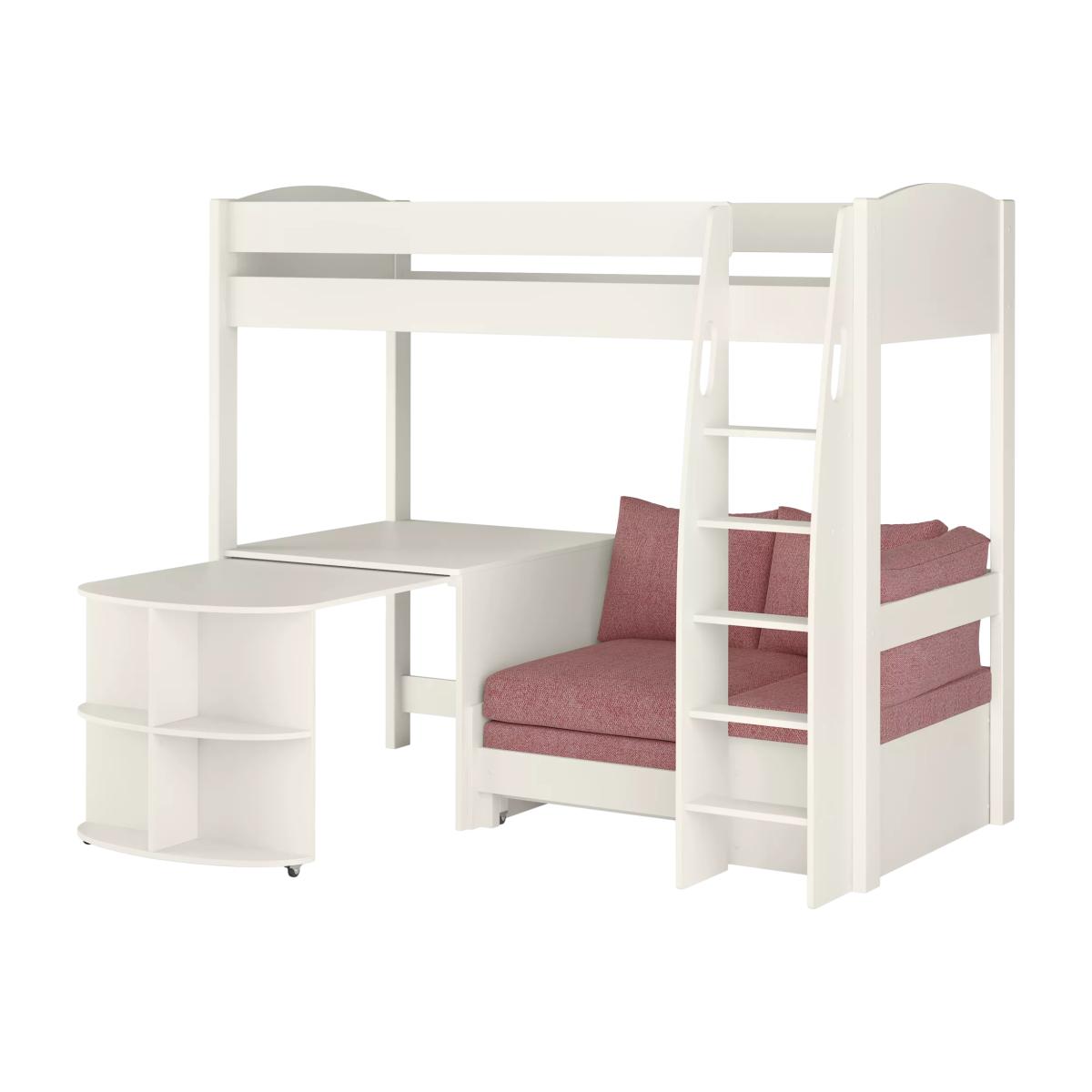 Make the most of every inch with the Uno S 22 High Sleeper - a thoughtfully designed, space-saving solution ideal for smaller bedrooms. Featuring a smooth white finish and timeless aesthetic, it blends seamlessly with any décor while offering impressive functionality. With its versatile design, the ladder and desk can be positioned on either side, allowing you to tailor the setup to suit your room layout. From sleepovers to study sessions, this multi-functional high sleeper is built to grow with your child while keeping their space organised, safe, and stylish. Sofa by Day, Bed by Night The premium upholstered sofa offers a cosy lounge area that effortlessly pulls out into a comfortable single guest bed - perfect for sleepovers or unexpected visitors. Dedicated Desk for Study and Creativity The integrated desk provides a smart, fixed workspace ideal for homework, art, or gaming, encouraging focus and creativity. Customisable Ladder with Safety Features Designed for comfort and security, the ladder features extra-wide steps and ergonomic grab handles. Plus, it can be positioned on either side of the bed for maximum room layout flexibility. Extra Long Single Mattress Compatible Built to accommodate an Extra Long Single mattress, this bed ensures your child has the space they need for a comfortable night’s sleep as they grow. Durable and Dependable Construction Crafted from high-quality materials, the Uno S 22 High Sleeper is engineered for strength, stability, and long-term use. Safety First, Always With its sturdy build, wide ladder steps, and secure grab handles, the Uno S 22 puts your child’s safety at the forefront, giving you peace of mind day and night.