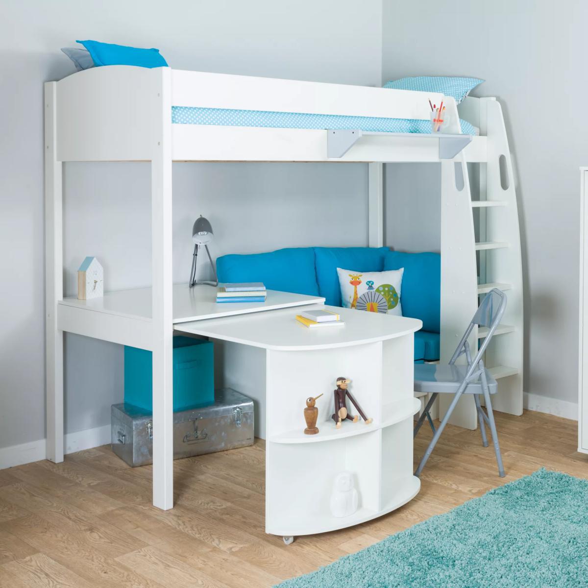Combining functionality and comfort, this safe and study bed from Stompa is a favourite for little ones. Crafted from pine and MDF and designed for an extra long single mattress (W90 x L200cm) it features solid wooden slats and an attractive rounded headboard that's available in a choice of white and grey colourways. The ladder has been ergonomically designed with comfortable treads so that your child can climb easily up and down, whilst cut-out grab handles on either side offer an extra, reassuring layer of safety. Featuring a pull-out desk that has been designed with castors for ease of use, it boasts additional storage space with four cube cubbyholes, ideal for displaying books, games and craft materials. By night, transform it into a comfortable pull-out bed, ideal for when they have friends over to stay. The solid wood slat system allows for easy extension, and together with the hinged foam cushion seat, it enables a comfortable sleeping surface. Choose from grey or aqua cushions. Boasting a white laquered finish and feature design elements, this is a brilliant, space-saving solution for their bedroom. This bed takes a continental single mattress, available to purchase separately. Stompa has been manufacturing safe furniture for active children for over half a century. Their furniture is functional and competitively priced aiming to fulfill all your child`s needs. Whether it`s a place to sleep, play, do homework or use their computer, Stompa provide storage and seating solutions that easily convert to an extra bed for sleepovers as well as a range of coordinating accessories. Our children's furniture ranges pass all British Standards safety and quality. We go beyond the legal requirements when we design our furniture, so that you and your child can both sleep soundly. Please note: not all our ranges are on display in our shops. 0% APR Representative: this product is eligible for Interest Free Credit, available when you spend £1000 or more on selected home products. Terms and conditions apply